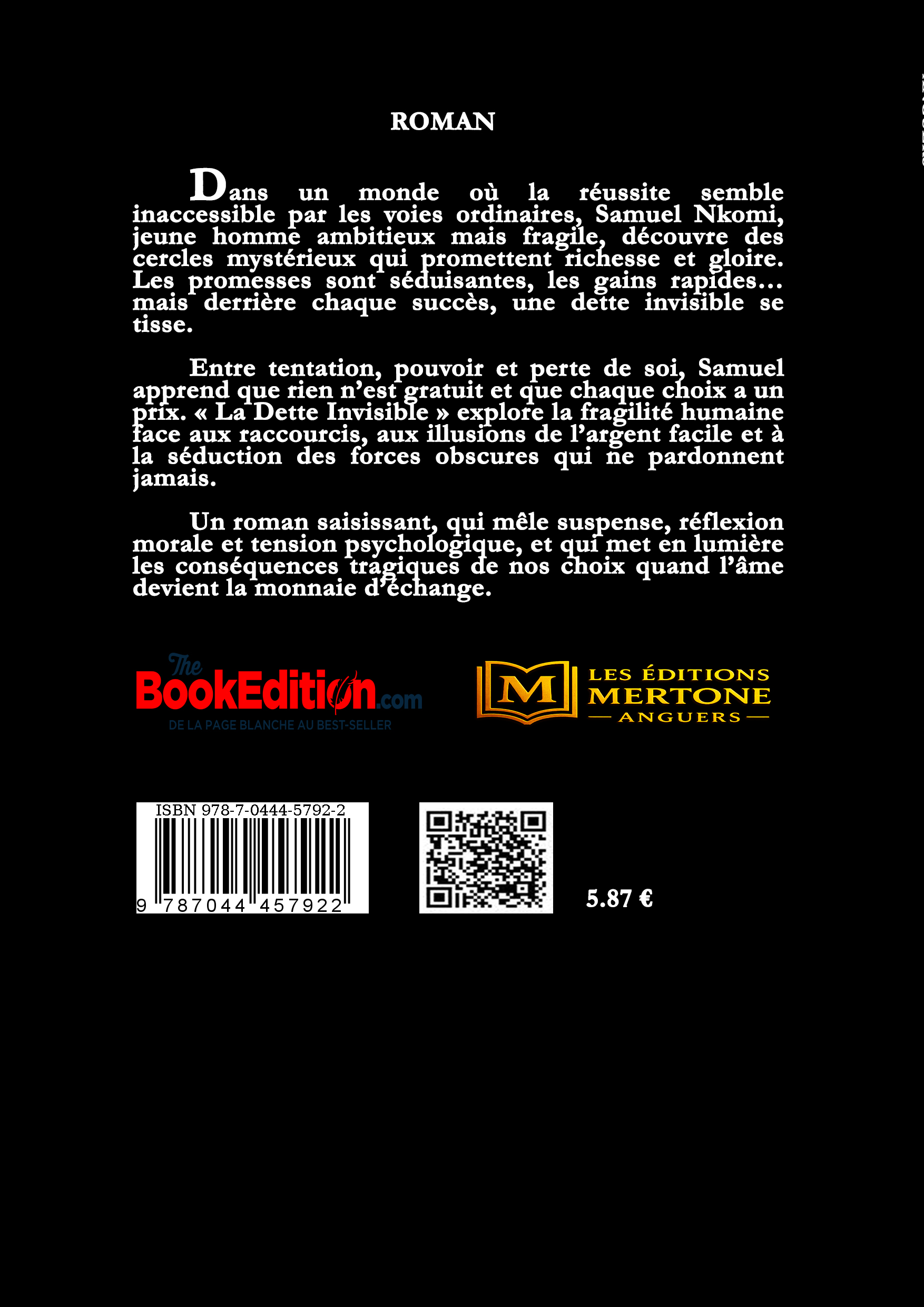 Samuel Nkomi, jeune diplômé sans avenir apparent, cède à la tentation des cercles occultes qui promettent richesse et ascension sociale sans sacrifices humains. Très vite, l’argent arrive, les portes s’ouvrent, mais autour de lui les morts et les drames se multiplient, silencieux. Pris au piège d’une dette invisible, Samuel comprend que chaque gain exige un prix que l’on ne choisit pas toujours. Entre compromission, perte de conscience et illusion de liberté, *La Dette Invisible* est un roman sombre et lucide sur les raccourcis de la réussite et le coût réel de la gloire.