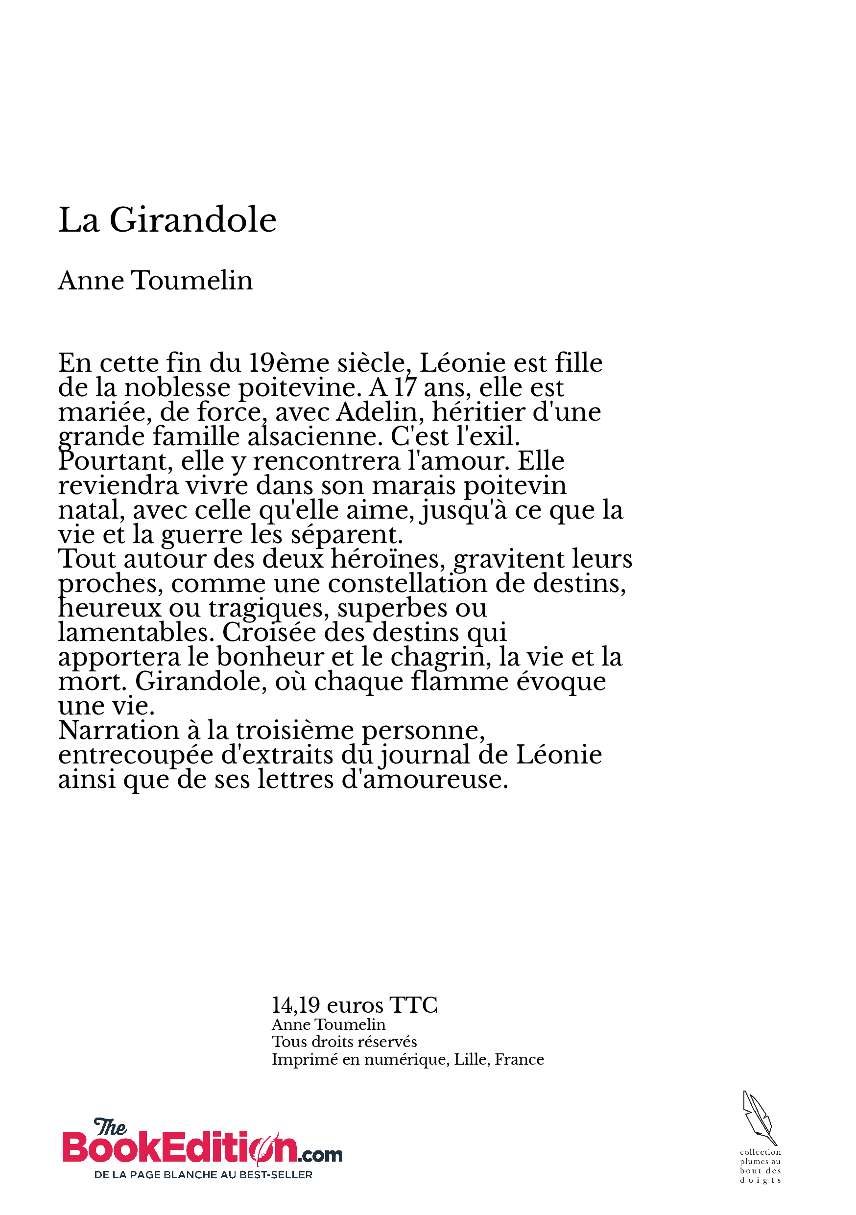 Aux yeux d'Amélina, la mariée était la plus belle de toutes. Elle l'apercevait, là bas, trop loin à son goût, entre les halos tremblants de deux girandoles surchargées d'ors et de cristaux. Ils conféraient à sa toute nouvelle belle-s??ur cet éclat doré qu'on voit aux madones des icônes, lui donnaient un air lointain de sainte triste, suscitaient mille étincelles dans ses prunelles sombres, rendaient mystérieux ses cheveux bruns coiffés avec art et dans lesquels brillaient sourdement des rangs de perles tressés au c??ur des boucles relevées, échauffaient l'épais brocard ivoire rebrodé, éveillaient mille feux au diamant qu'Adelin avait passé au doigt de sa fiancée, là-bas, dans ce marais lointain de la France interdite, ce pays mystérieux, cette patrie perdue qui achevait d'auréoler la mariée d'un mystère fascinant