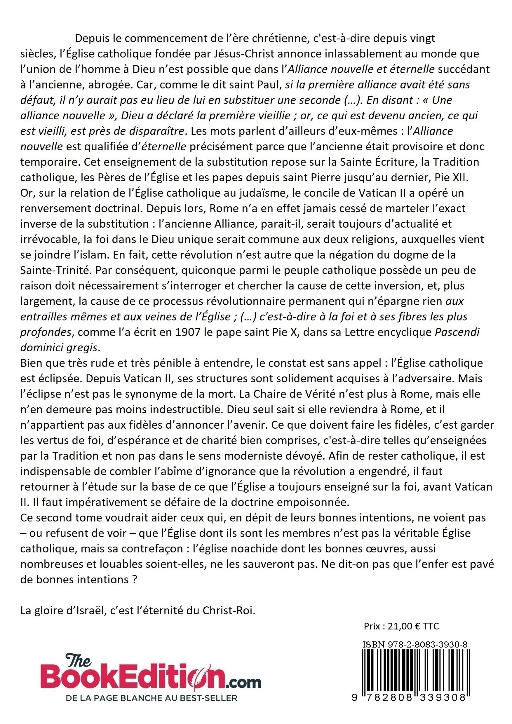 Sur la relation de l’Église catholique au judaïsme, le concile de Vatican II a opéré une révolution, c'est-à-dire un renversement doctrinal. Depuis lors, Rome n’a en effet jamais cessé de marteler l’exact inverse de l'invariable doctrine catholique de la substitution : l’ancienne Alliance, parait-il, serait toujours d’actualité et irrévocable, la foi dans le Dieu unique serait commune aux deux religions, auxquelles vient se joindre l’islam. Cette révolution n’est autre que la négation du dogme de la Sainte-Trinité, autrement dit : l’apostasie. Par conséquent, quiconque parmi le peuple catholique possède un peu de raison doit nécessairement s’interroger et chercher à comprendre la cause de cette inversion.