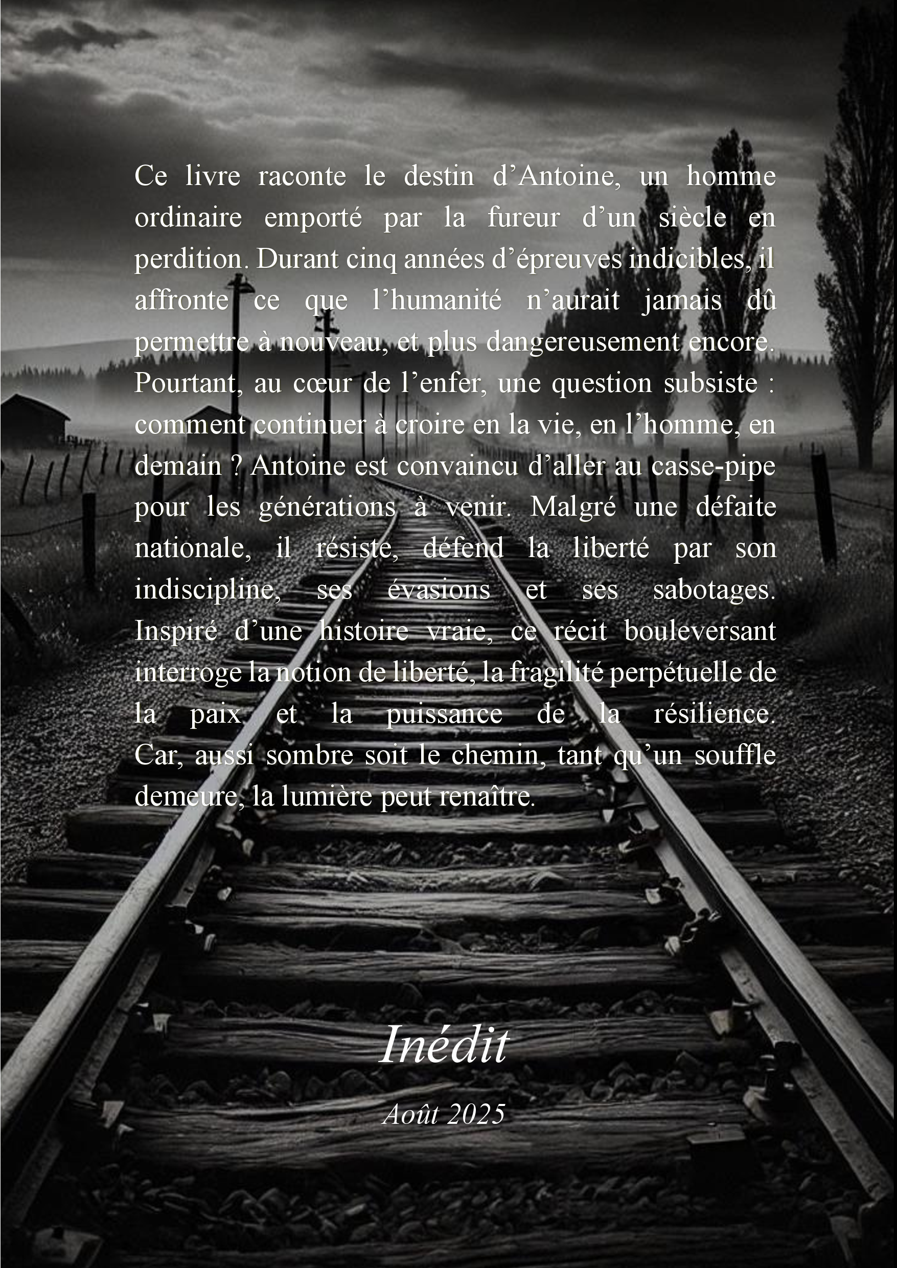 Ce livre raconte le destin d’Antoine, un homme ordinaire emporté par la fureur d’un siècle en perdition. À travers cinq années d’épreuves inimaginables, il affronte ce que l’humanité aurait dû ne jamais permettre une nouvelle fois. Mais au cœur de l’enfer, une question subsiste : comment continuer à croire en la vie, en l’homme, en demain ? Antoine est persuadé d’aller au casse-pipe pour les générations suivantes. Malgré une défaite nationale, il résiste par ses évasions et ses sabotages. Inspiré d’une histoire vraie, ce récit interroge la notion de liberté, la fragilité perpétuelle de la paix et la force de résilience. Car aussi sombre soit le chemin, tant qu’un souffle demeure, la lumière peut renaître.