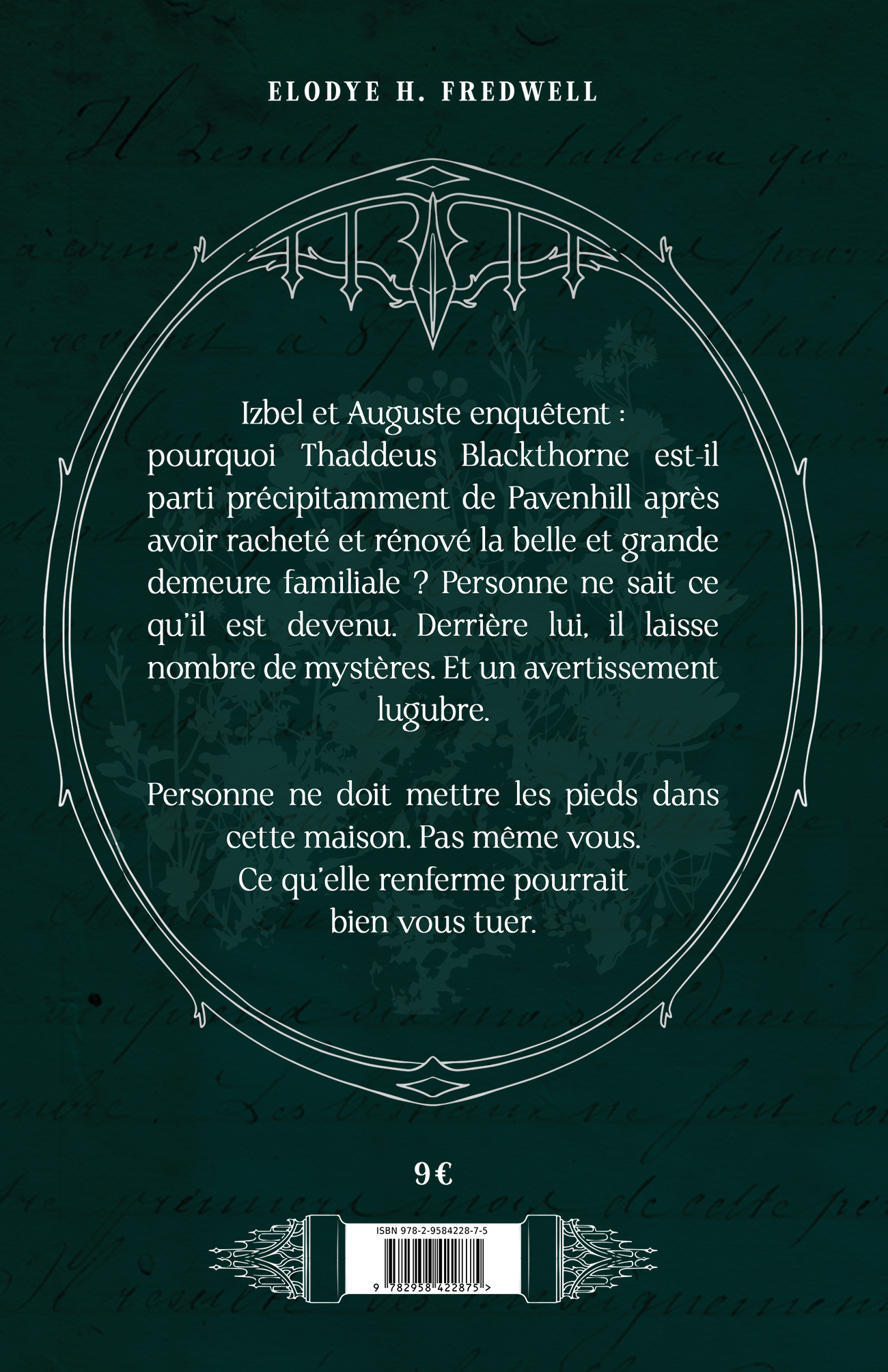 Izbel et Auguste enquêtent : pourquoi Thaddeus Blackthorne est-il parti précipitamment de Pavenhill après avoir racheté et rénové la belle et grande demeure familiale ? Personne ne sait ce qu'il est devenu. Derrière lui, il laisse nombre de mystères. Et un avertissement lugubre.