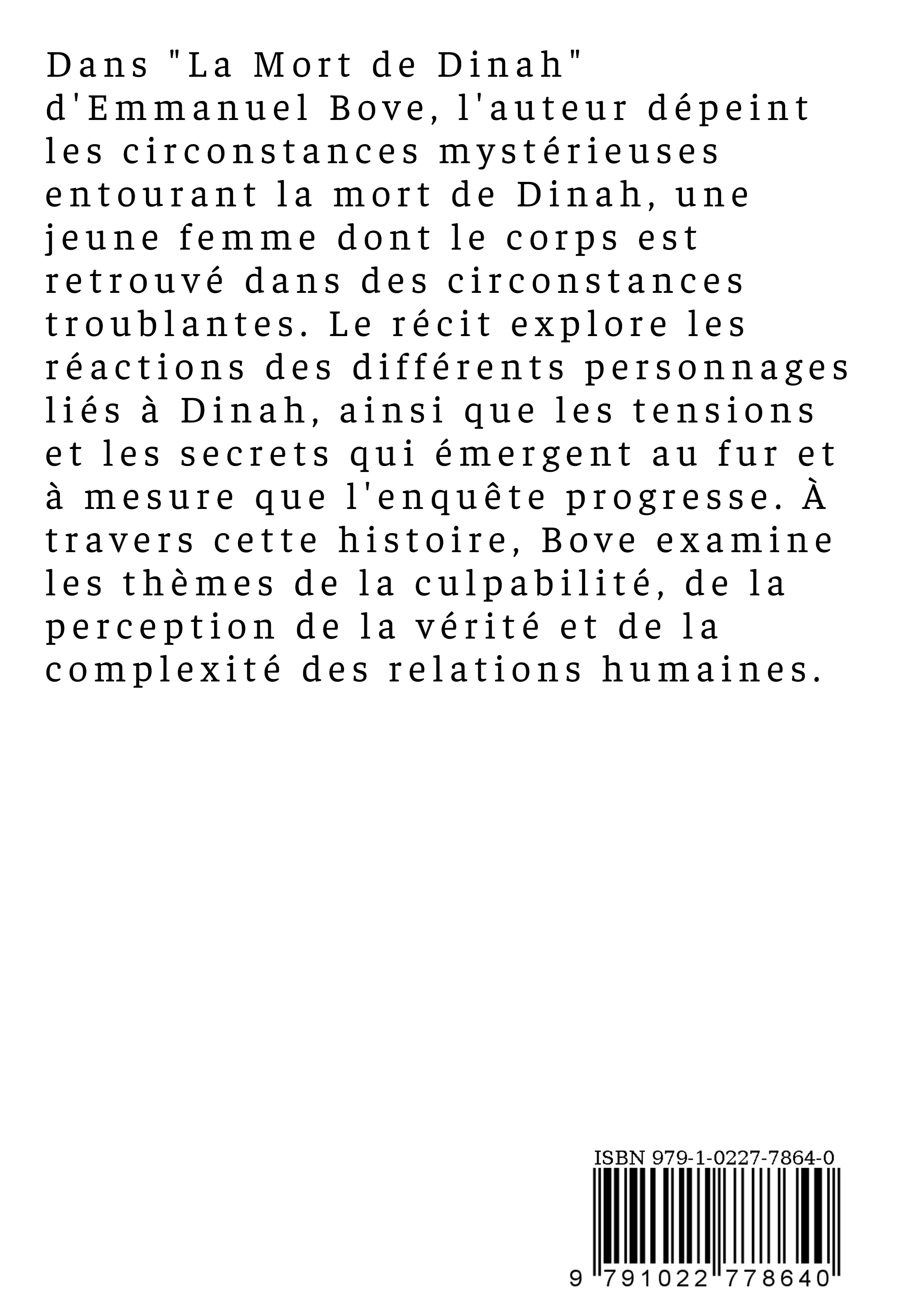 Dans "La Mort de Dinah" d'Emmanuel Bove, l'auteur dépeint les circonstances mystérieuses entourant la mort de Dinah, une jeune femme dont le corps est retrouvé dans des circonstances troublantes. Le récit explore les réactions des différents personnages liés à Dinah, ainsi que les tensions et les secrets qui émergent au fur et à mesure que l'enquête progresse. À travers cette histoire, Bove examine les thèmes de la culpabilité, de la perception de la vérité et de la complexité des relations humaines
