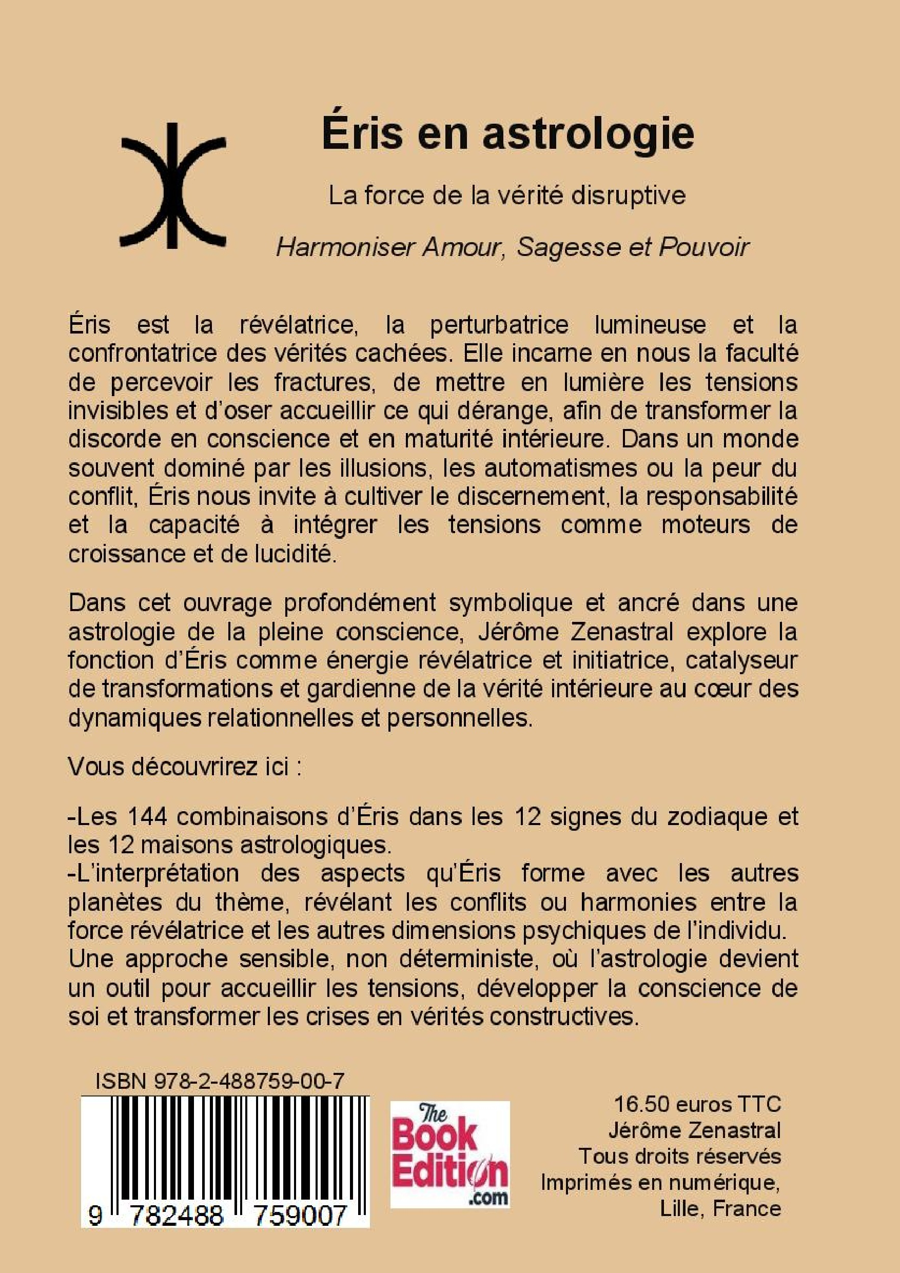 Éris incarne en nous la faculté de percevoir les fractures, de mettre en lumière les tensions invisibles et d’oser accueillir ce qui dérange, afin de transformer la discorde en conscience et en maturité intérieure. Dans cet ouvrage ancré dans une astrologie de la pleine conscience, Jérôme Zenastral explore la fonction d’Éris comme énergie révélatrice et initiatrice, catalyseur de transformations et gardienne de la vérité intérieure au cœur des dynamiques relationnelles et personnelles. Vous découvrirez dans ce livre les 144 combinaisons d’Éris dans les 12 signes du zodiaque et les 12 maisons astrologiques, ainsi que l’interprétation des aspects qu’Éris forme avec les autres planètes du thème astral.