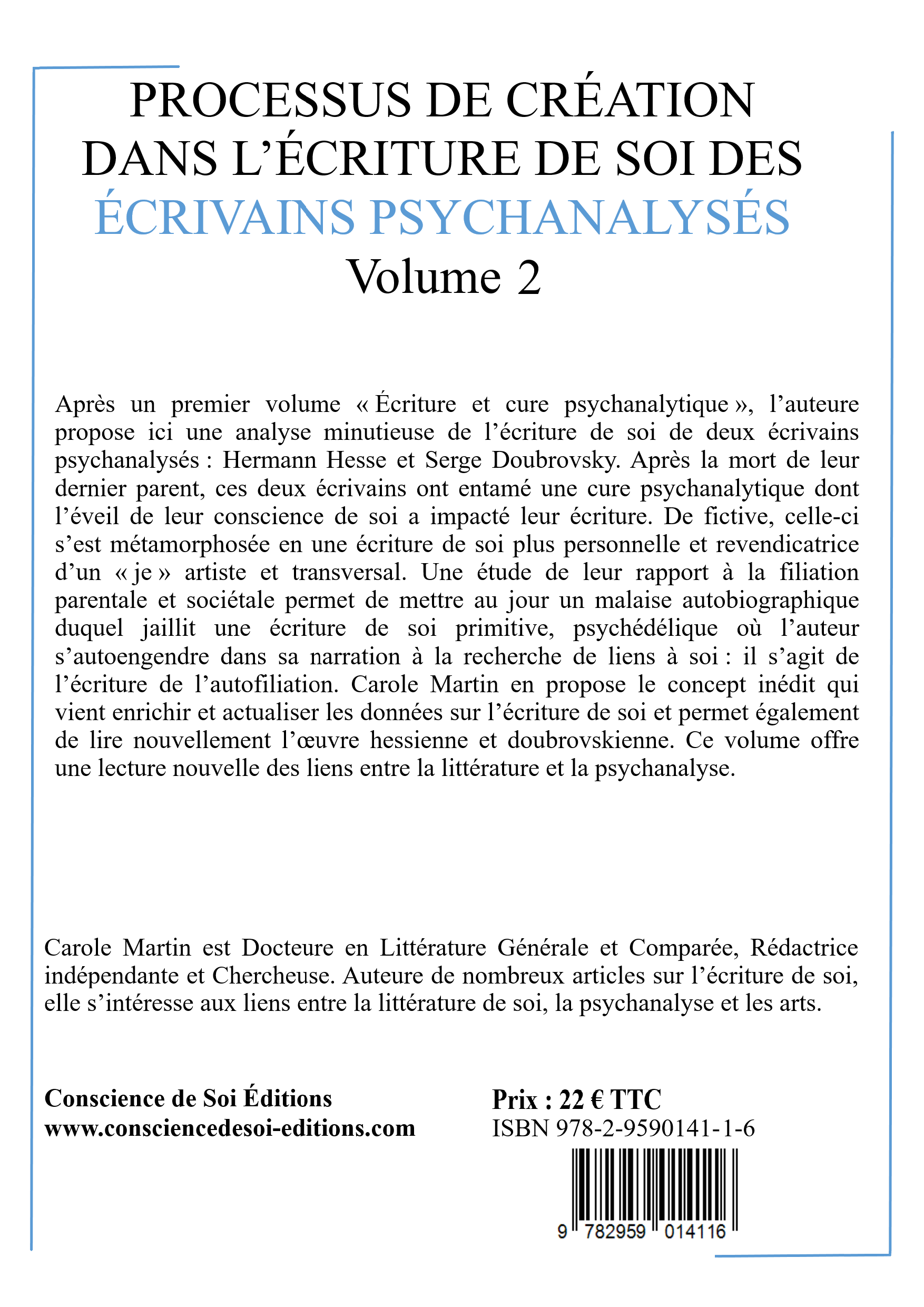 Après un premier volume « Écriture et cure psychanalytique », l’auteure propose ici une analyse minutieuse de l’écriture de soi de deux écrivains psychanalysés : Hermann Hesse et Serge Doubrovsky. Après la mort de leur dernier parent, ces deux écrivains ont entamé une cure psychanalytique dont l’éveil de leur conscience de soi a impacté leur écriture. De fictive, celle-ci s’est métamorphosée en une écriture de soi plus personnelle et revendicatrice d’un « je » artiste et transversal. Une étude de leur rapport à la filiation permet de mettre au jour un malaise autobiographique duquel jaillit une écriture de soi où l’auteur s’autoengendre dans sa narration à la recherche de liens à soi : l’écriture de l’autofiliation.