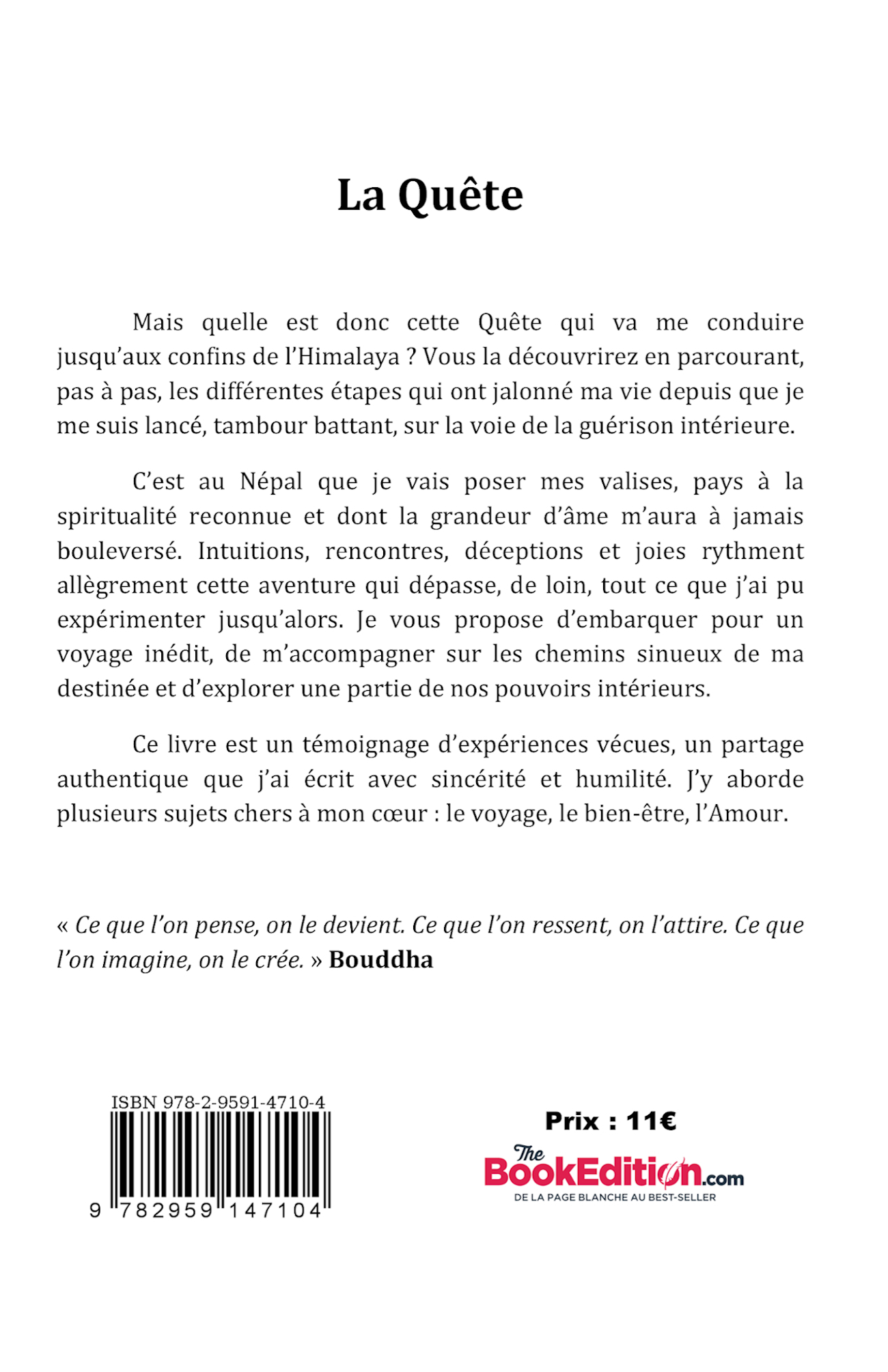 Je viens de terminer la lecture de LA QUETE, et je dois dire que j'ai été profondément touché par son récit. À travers son expédition asiatique, Gauthier nous livre un voyage intérieur aussi captivant que révélateur. Sa plume nous emmène dans un périple empreint de découvertes personnelles, d'introspection et de moments de grâce. Chaque page est imprégnée d'une sincérité et d'une authenticité qui nous permettent de nous immerger totalement dans son expérience. Ce livre est bien plus qu'un simple récit de voyage, c'est une véritable invitation à explorer les méandres de l'âme humaine. Bravo à Gauthier pour cette œuvre remarquable et inspirante!