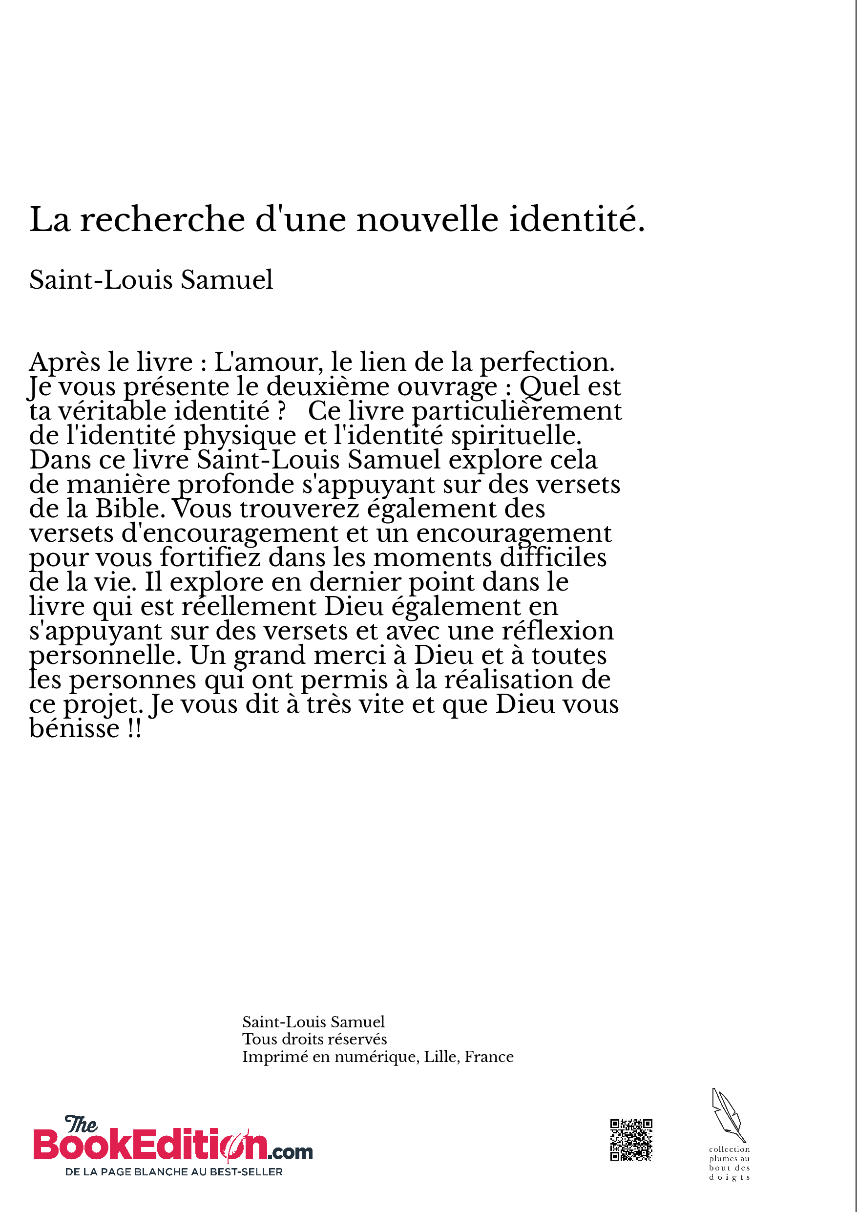 Après le livre : L'amour, le lien de la perfection. Je vous présente le deuxième ouvrage : Quel est ta véritable identité ? Ce livre parle de l'identité physique et l'identité spirituelle. Dans ce livre, Saint-Louis Samuel explore de manière profonde ces différentes identités tout en s'appuyant sur des versets du livre le plus célèbre : La Bible. Vous trouverez également des versets d'encouragement et un encouragement pour vous fortifiez dans les moments difficiles que la vie donne. Il explore en dernier point dans le livre qui est réellement Dieu également en s'appuyant sur des versets et avec une réflexion personnelle. Un grand merci à Dieu et à toutes les personnes qui ont permis à la réalisation de ce projet.