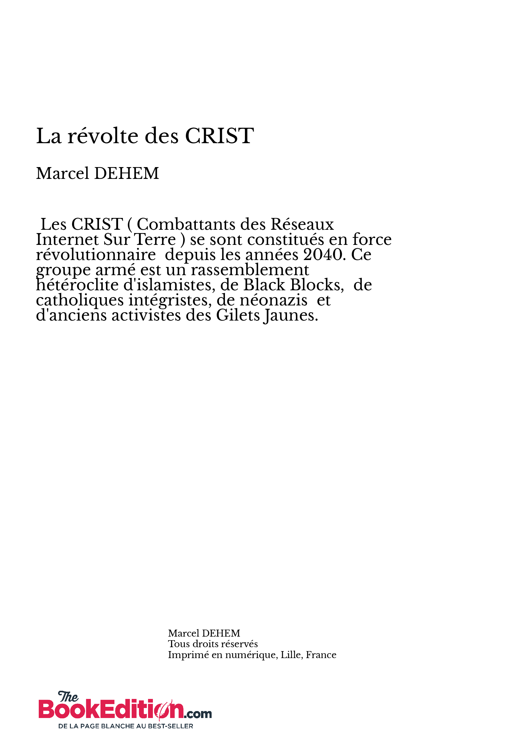 Les CRIST ( Combattants des Réseaux Internet Sur Terre ) se sont constitués en force révolutionnaire depuis les années 2040. Ce groupe armé est un rassemblement hétéroclite d'islamistes, de Black Blocks, de catholiques intégristes, de néonazis et d'anciens activistes des Gilets Jaunes.
