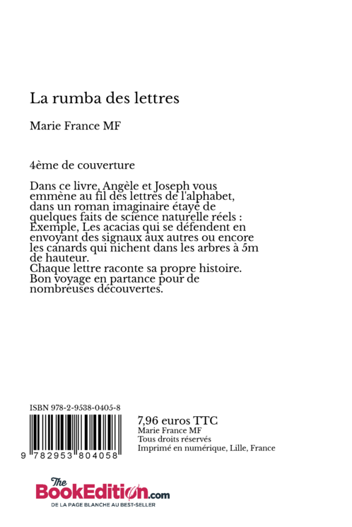 Dans ce livre, Angèle et Joseph vous emmène au fil des lettres de l'alphabet, dans un roman imaginaire étayé de quelques faits de science naturelle réels : Exemple, Les acacias qui se défendent en envoyant des signaux aux autres ou encore les canards qui nichent dans les arbres à 5m de hauteur. Chaque lettre raconte sa propre histoire. Bon voyage en partance pour de nombreuses découvertes.