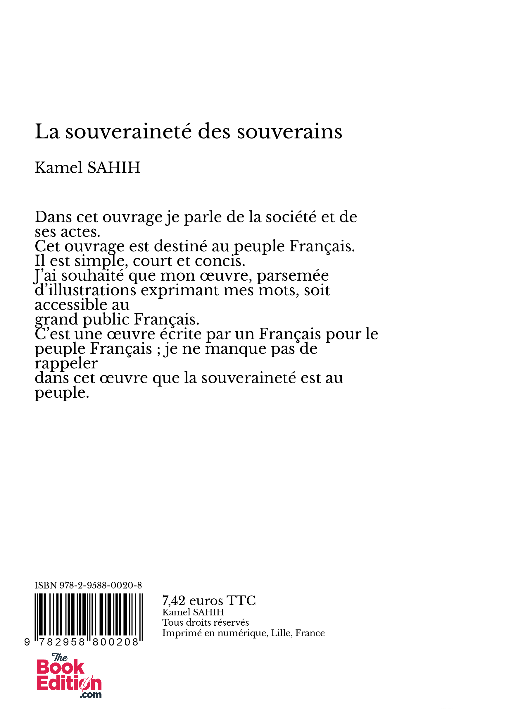 Dans cet ouvrage je parle de la société et de ses actes. Cet ouvrage est destiné au peuple Français. Il est simple, court et concis. J’ai souhaité que mon œuvre, parsemée d’illustrations exprimant mes mots, soit accessible au grand public Français. C’est une œuvre écrite par un Français pour le peuple Français ; je ne manque pas de rappeler dans cet œuvre que la souveraineté est au peuple.
