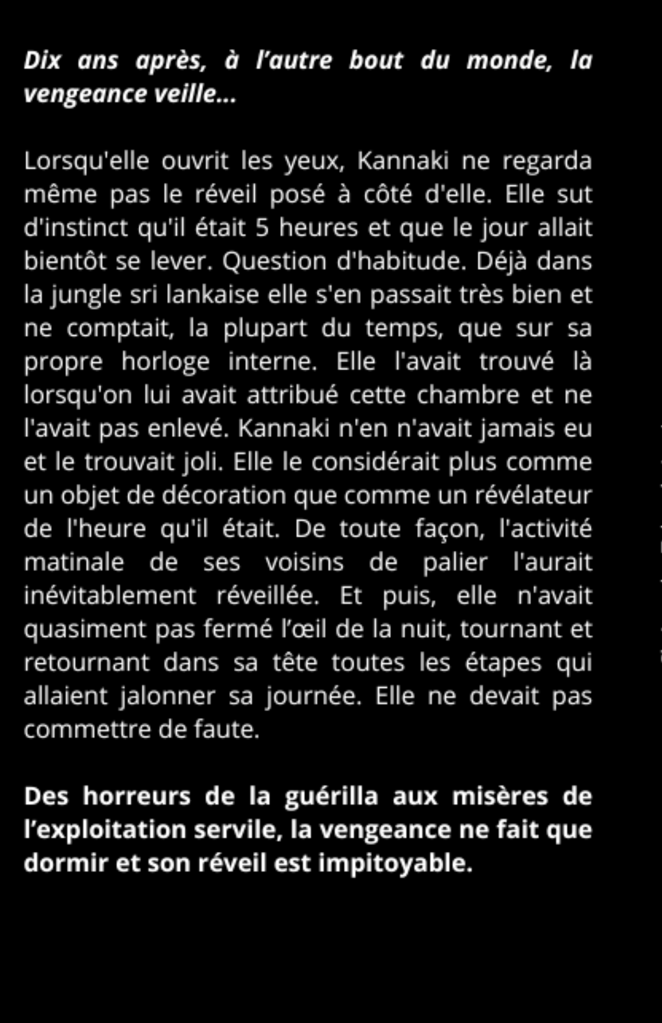 Kannaki ne regarda même pas le réveil posé à côté d'elle. Elle sut d'instinct qu'il était 5 heures et que le jour allait bientôt se lever. Question d'habitude. Déjà dans la jungle sri lankaise elle s'en passait très bien et ne comptait, la plupart du temps, que sur sa propre horloge interne. Elle l'avait trouvé là lorsqu'on lui avait attribué cette chambre et ne l'avait pas enlevé. Elle n'en n'avait jamais eu et le trouvait joli. Elle le considérait plus comme un objet de décoration que comme un révélateur de l'heure qu'il était. L'activité matinale de ses voisins de palier l'aurait inévitablement réveillée.