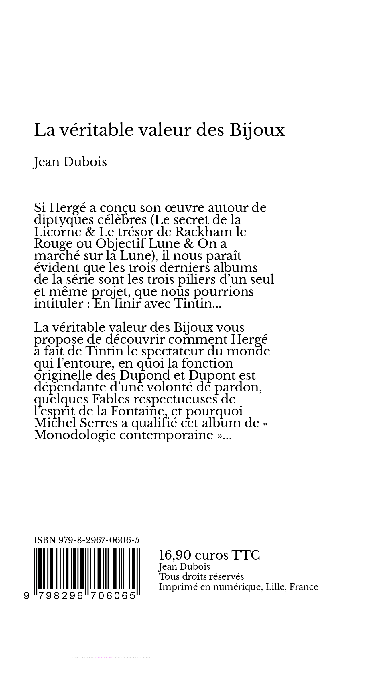 La véritable valeur des Bijoux vous propose de découvrir comment Hergé a fait de Tintin le spectateur du monde qui l’entoure, en quoi la fonction originelle des Dupond et Dupont est dépendante d’une volonté de pardon, quelques Fables respectueuses de l’esprit de la Fontaine, et pourquoi Michel Serres a qualifié cet album de « Monodologie contemporaine »...