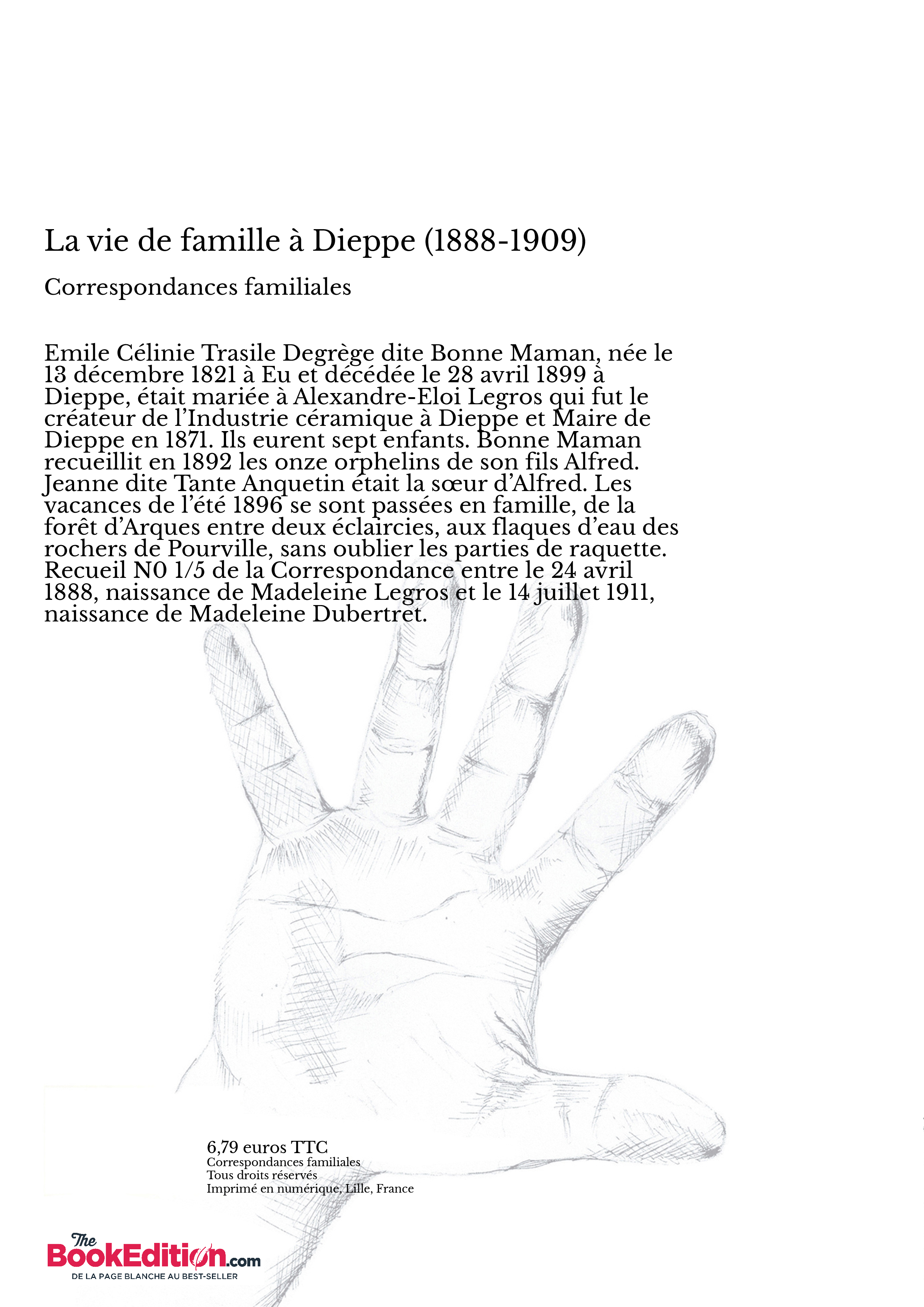 Emile Célinie Trasile Degrège dite Bonne Maman, née le 13 décembre 1821 à Eu et décédée le 28 avril 1899 à Dieppe, était mariée à Alexandre-Eloi Legros qui fut le créateur de l’Industrie céramique à Dieppe et Maire de Dieppe en 1871. Ils eurent sept enfants. Bonne Maman recueillit en 1892 les onze orphelins de son fils Alfred. Jeanne dite Tante Anquetin était la sœur d’Alfred. Les vacances de l’été 1896 se sont passées en famille, de la forêt d’Arques entre deux éclaircies, aux flaques d’eau des rochers de Pourville, sans oublier les parties de raquette.