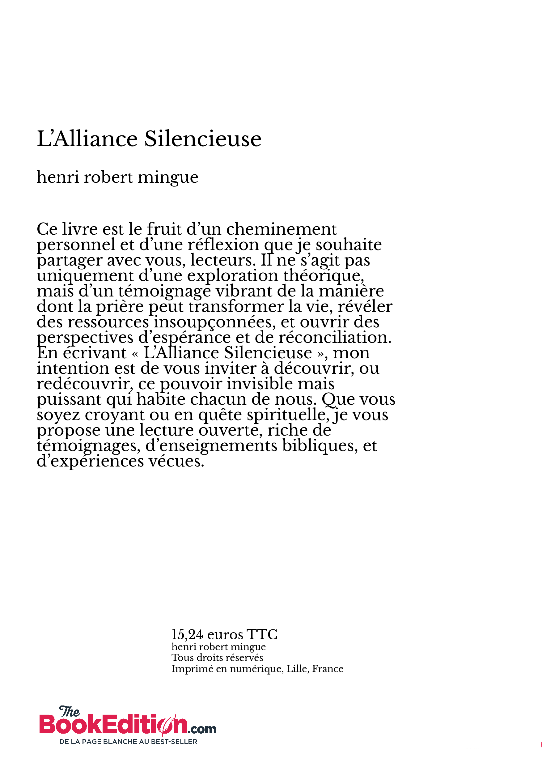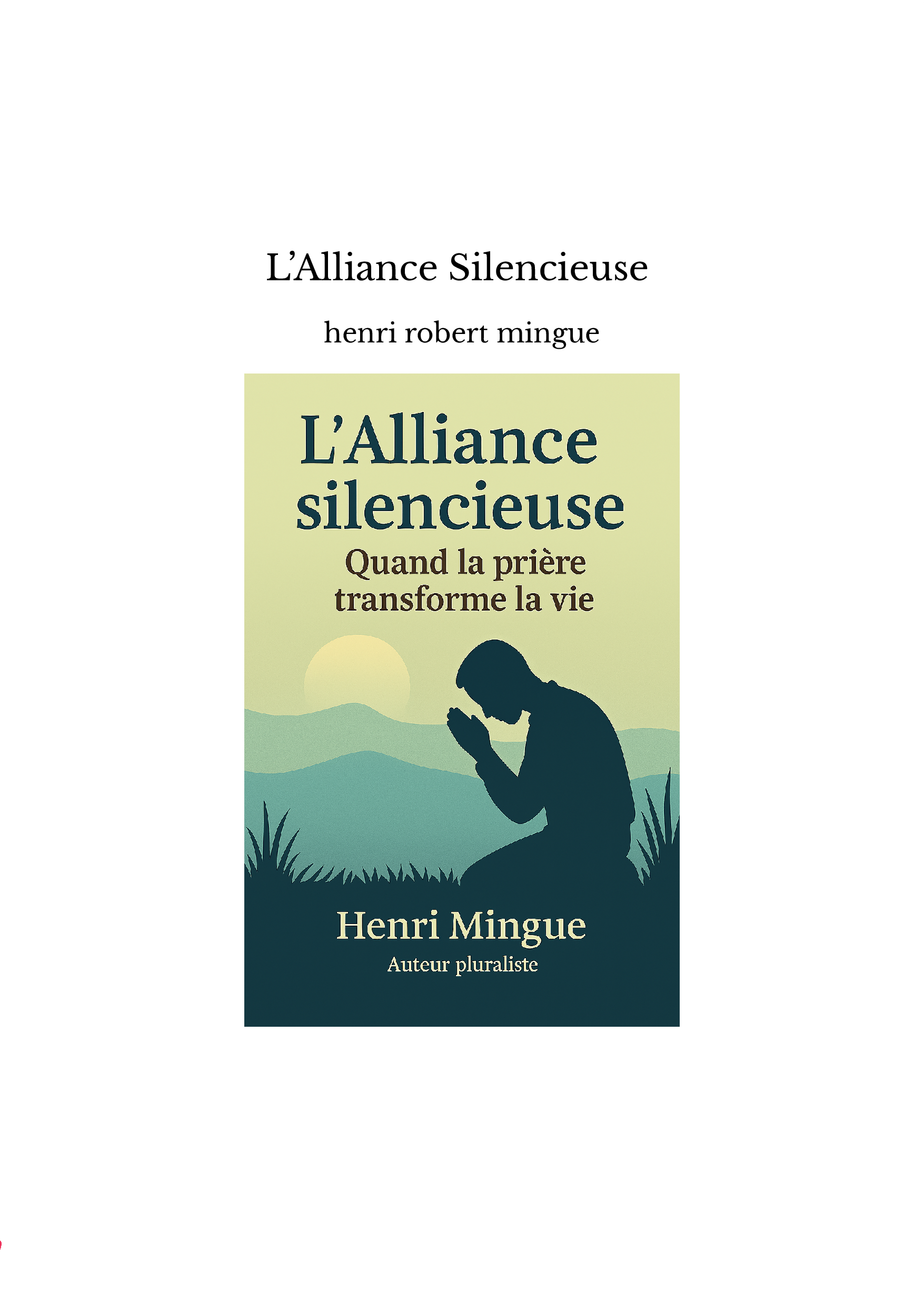 En écrivant « L’Alliance Silencieuse », mon intention est de vous inviter à découvrir, ou redécouvrir, ce pouvoir invisible mais puissant qui habite chacun de nous. Que vous soyez croyant ou en quête spirituelle, je vous propose une lecture ouverte, riche de témoignages, d’enseignements bibliques, et d’expériences vécues.