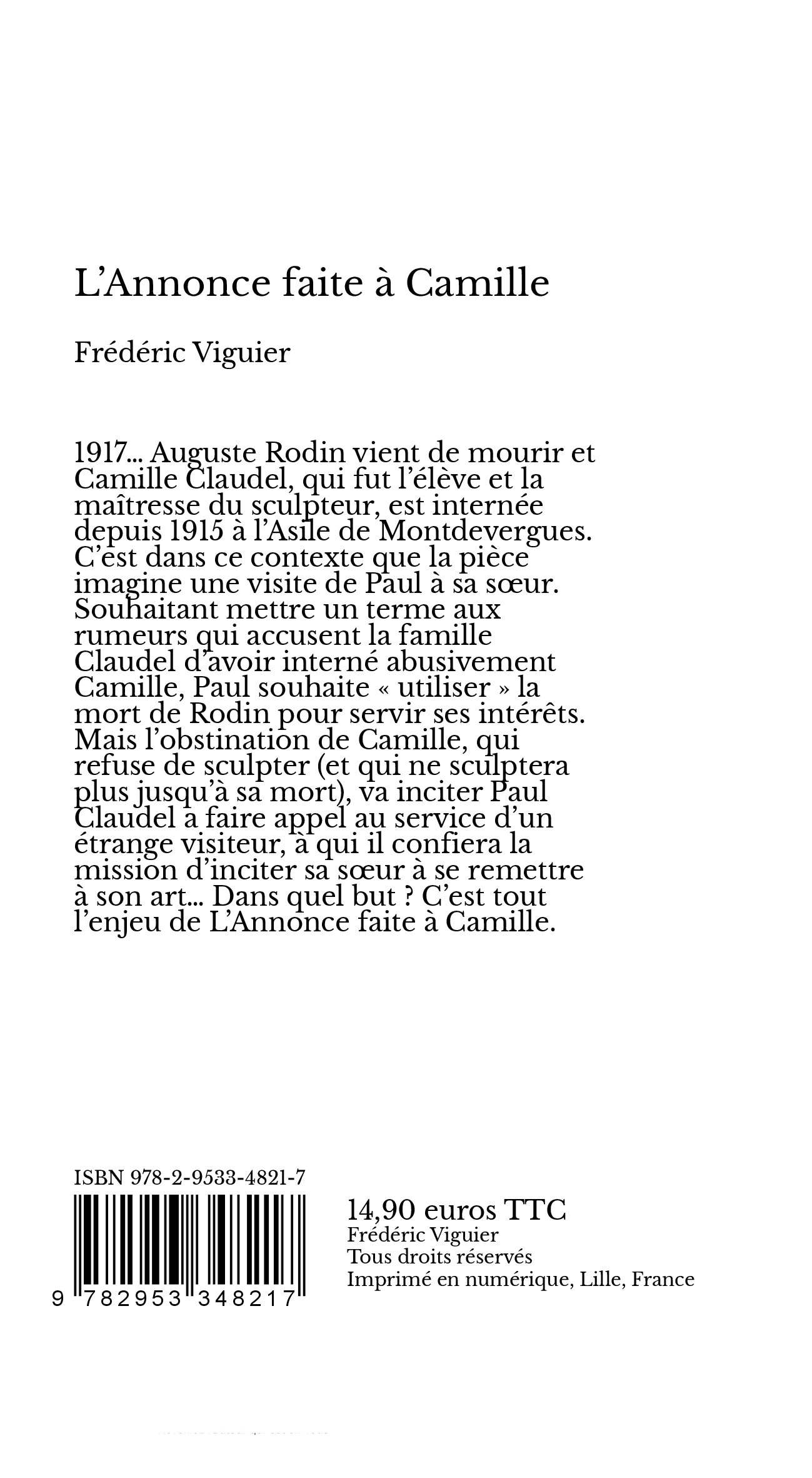 1917… Auguste Rodin vient de mourir et Camille Claudel, qui fut l’élève et la maîtresse du sculpteur, est internée depuis 1915 à l’Asile de Montdevergues. C’est dans ce contexte que la pièce imagine une visite de Paul à sa sœur. Souhaitant mettre un terme aux rumeurs qui accusent la famille Claudel d’avoir interné abusivement Camille, Paul souhaite « utiliser » la mort de Rodin pour servir ses intérêts. Mais l’obstination de Camille, qui refuse de sculpter (et qui ne sculptera plus jusqu’à sa mort), va inciter Paul Claudel a faire appel au service d’un étrange visiteur, à qui il confiera la mission d’inciter sa sœur à se remettre à son art… Dans quel but ? C’est tout l’enjeu de L’Annonce faite à Camille.