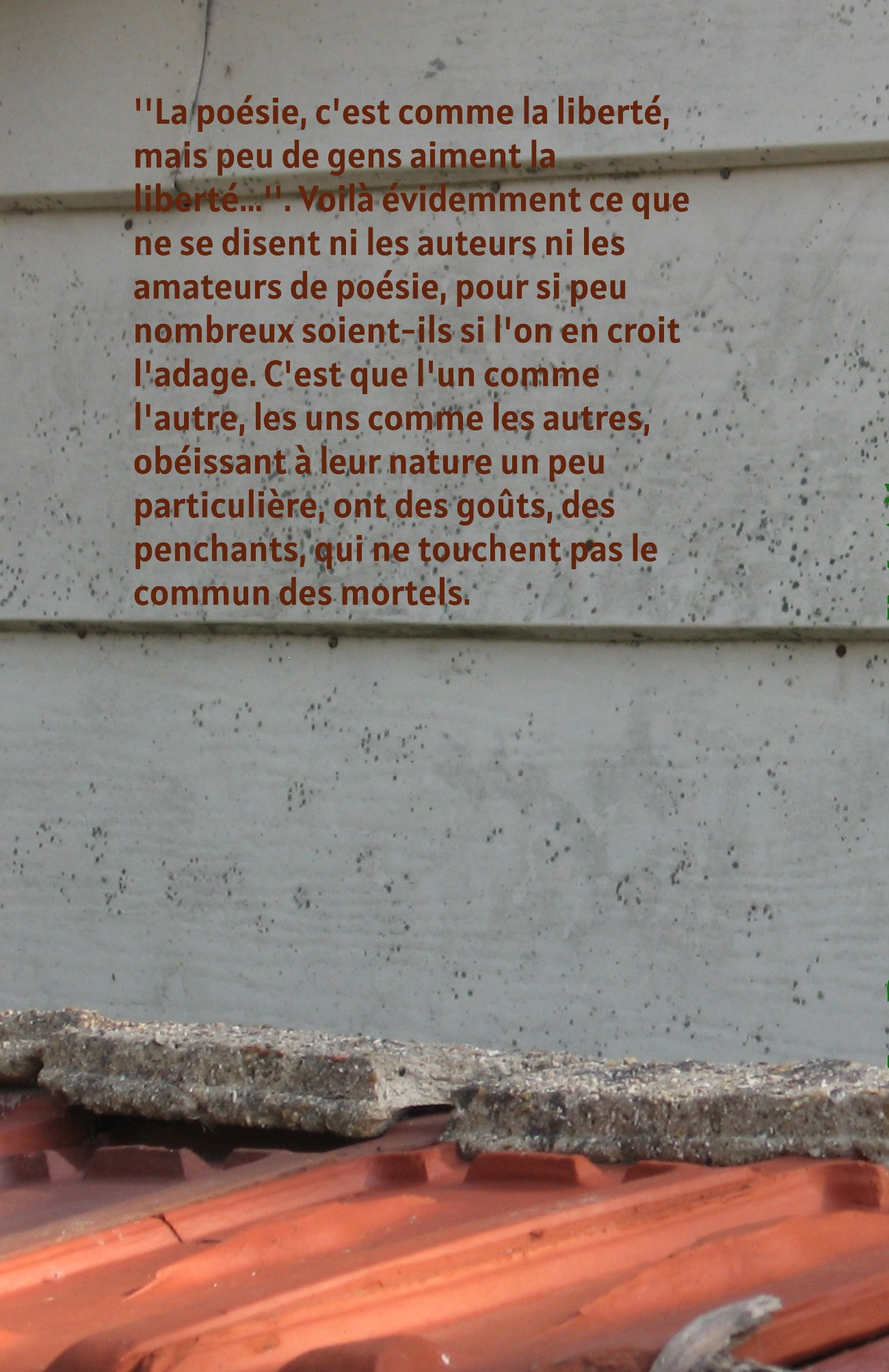 ''La poésie, c'est comme la liberté, mais peu de gens aiment la liberté...''. Voilà évidemment ce que ne se disent ni les auteurs ni les amateurs de poésie, pour si peu nombreux soient-ils si l'on en croit l'adage. C'est que l'un comme l'autre, les uns comme les autres, obéissant à leur nature un peu particulière, ont des goûts, des penchants, qui ne touchent pas le commun des mortels. Non que cela les rendent meilleurs que les autres, mais bien plutôt que cela marque leur différence à cet égard..