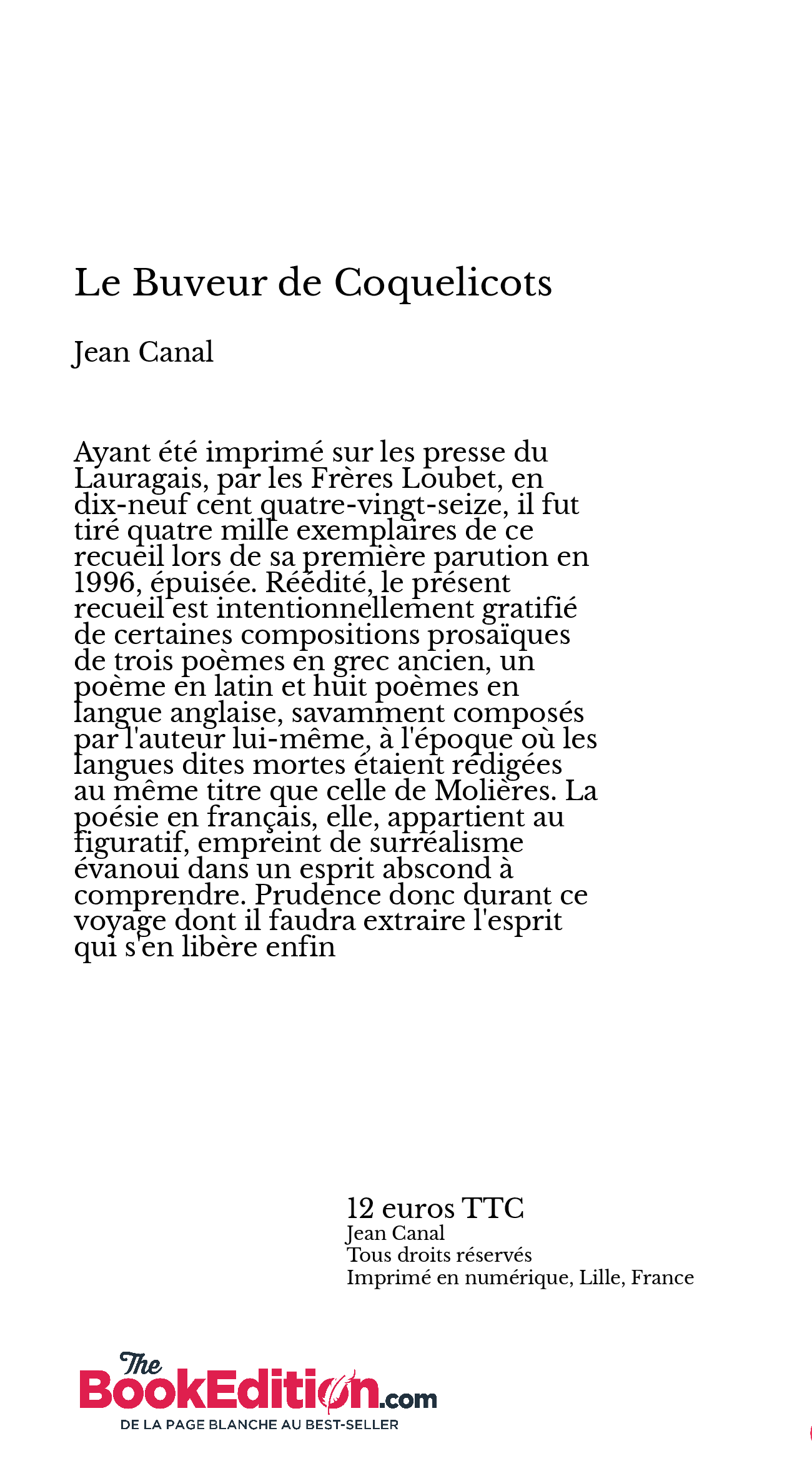 Ayant été imprimé sur les presse du Lauragais, par les Frères Loubet, en dix-neuf cent quatre-vingt-seize, il fut tiré quatre mille exemplaires de ce recueil lors de sa première parution en 1996, épuisée. Réédité, le présent recueil est intentionnellement gratifié de certaines compositions prosaïques de trois poèmes en grec ancien, un poème en latin et huit poèmes en langue anglaise, savamment composés par l'auteur lui-même, à l'époque où les langues dites mortes étaient rédigées au même titre que celle de Molières. La poésie en français, elle, appartient au figuratif, empreint de surréalisme évanoui dans un esprit abscond à comprendre. Prudence donc durant ce voyage dont il faudra extraire l'esprit qui s'en libère enfin