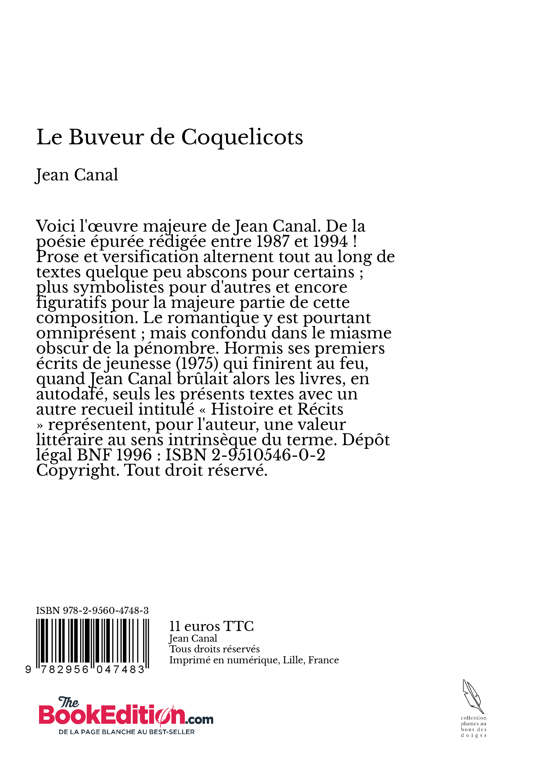 Voici l'œuvre majeure de Jean Canal. De la poésie épurée rédigée entre 1987 et 1994 ! Prose et versification alternent tout au long de textes quelque peu abscons pour certains ; plus symbolistes pour d'autres et encore figuratifs pour la majeure partie de cette composition. Le romantique y est pourtant omniprésent ; mais confondu dans le miasme obscur de la pénombre. Hormis ses premiers écrits de jeunesse (1975) qui finirent au feu, quand Jean Canal brûlait alors les livres, en autodafé, seuls les présents textes avec un autre recueil intitulé « Histoire et Récits » représentent, pour l'auteur, une valeur littéraire au sens intrinsèque du terme. Dépôt légal BNF en 1996 : ISBN 2-9510546-0-2