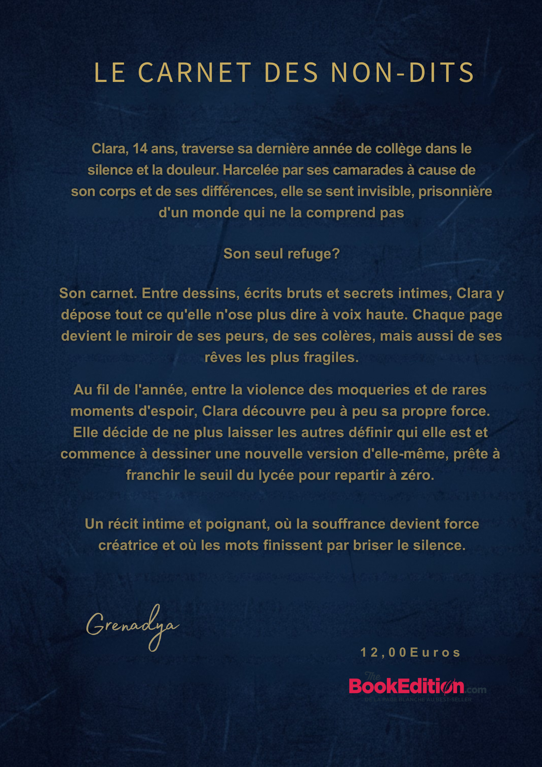 Clara, 14 ans, traverse sa dernière année de collège dans le silence. Harcelée pour ses différences, elle se sent invisible dans un monde qui l'ignore. Son seul refuge ? Son carnet. Entre dessins et secrets bruts, elle y dépose tout ce qu’elle n’ose plus dire. Chaque page devient le miroir de ses peurs, de ses colères et de ses rêves fragiles. Au fil de l'année, entre violence des moqueries et éclats d'espoir, Clara puise dans l'écriture une force insoupçonnée. Elle décide de ne plus laisser les autres la définir et dessine une nouvelle version d'elle-même, prête à franchir le seuil du lycée pour repartir à zéro.Un récit intime et poignant, où la souffrance devient création et où les mots finissent par briser le silence.