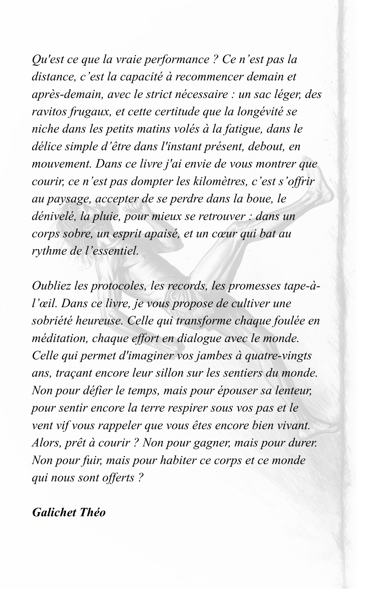 Oubliez les promesses tape-à-l’œil. Dans ce livre, je vous propose de cultiver une sobriété heureuse, un état d'esprit de course qui transforme chaque foulée en méditation, et qui permet d'imaginer vos jambes à 80 ans, traçant encore leur sillon sur les sentiers du monde.