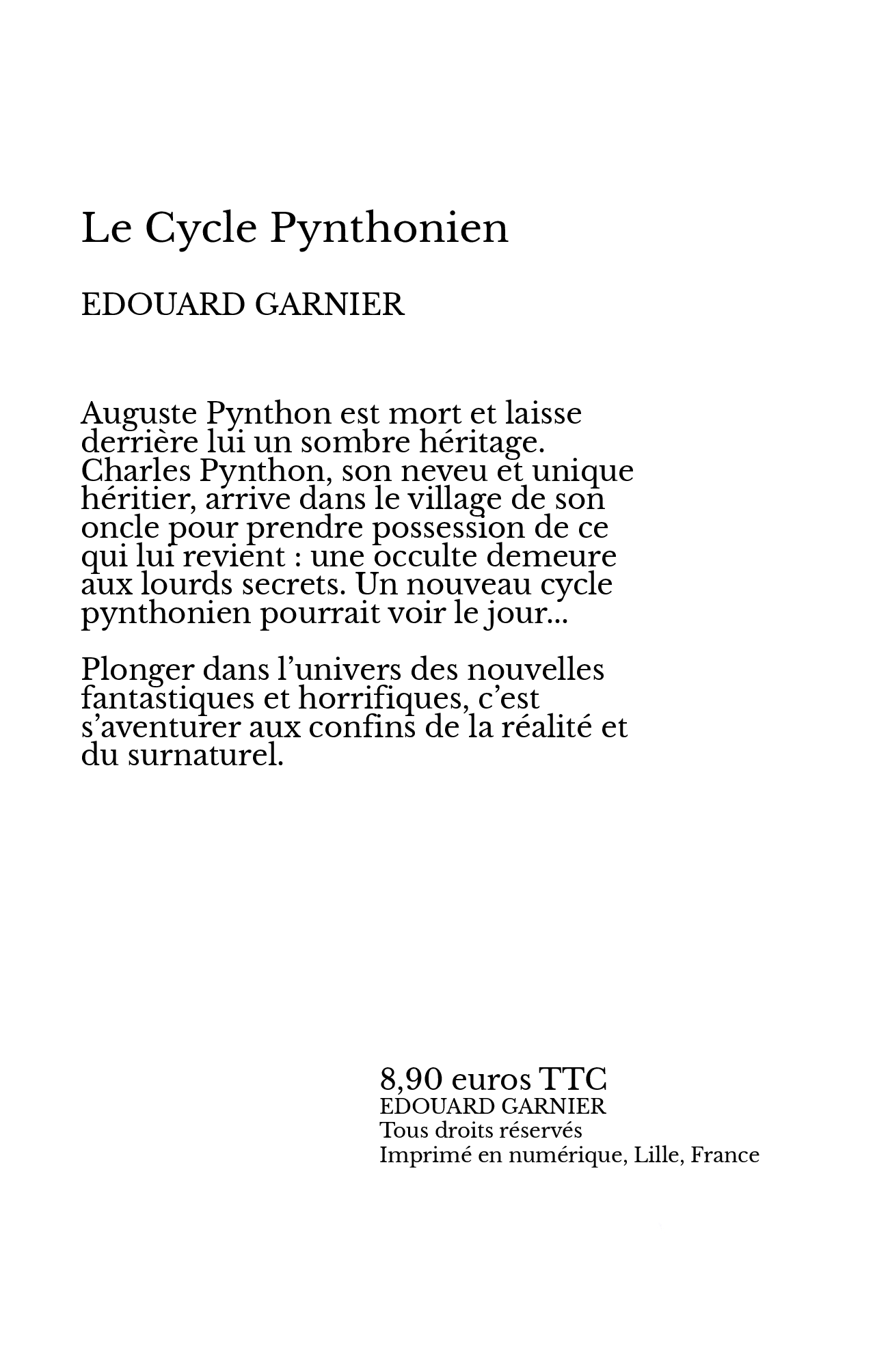 Auguste Pynthon est mort et laisse derrière lui un sombre héritage. Charles Pynthon, son neveu et unique héritier, arrive dans le village de son oncle pour prendre possession de ce qui lui revient : une occulte demeure aux lourds secrets. Un nouveau cycle pynthonien pourrait voir le jour...