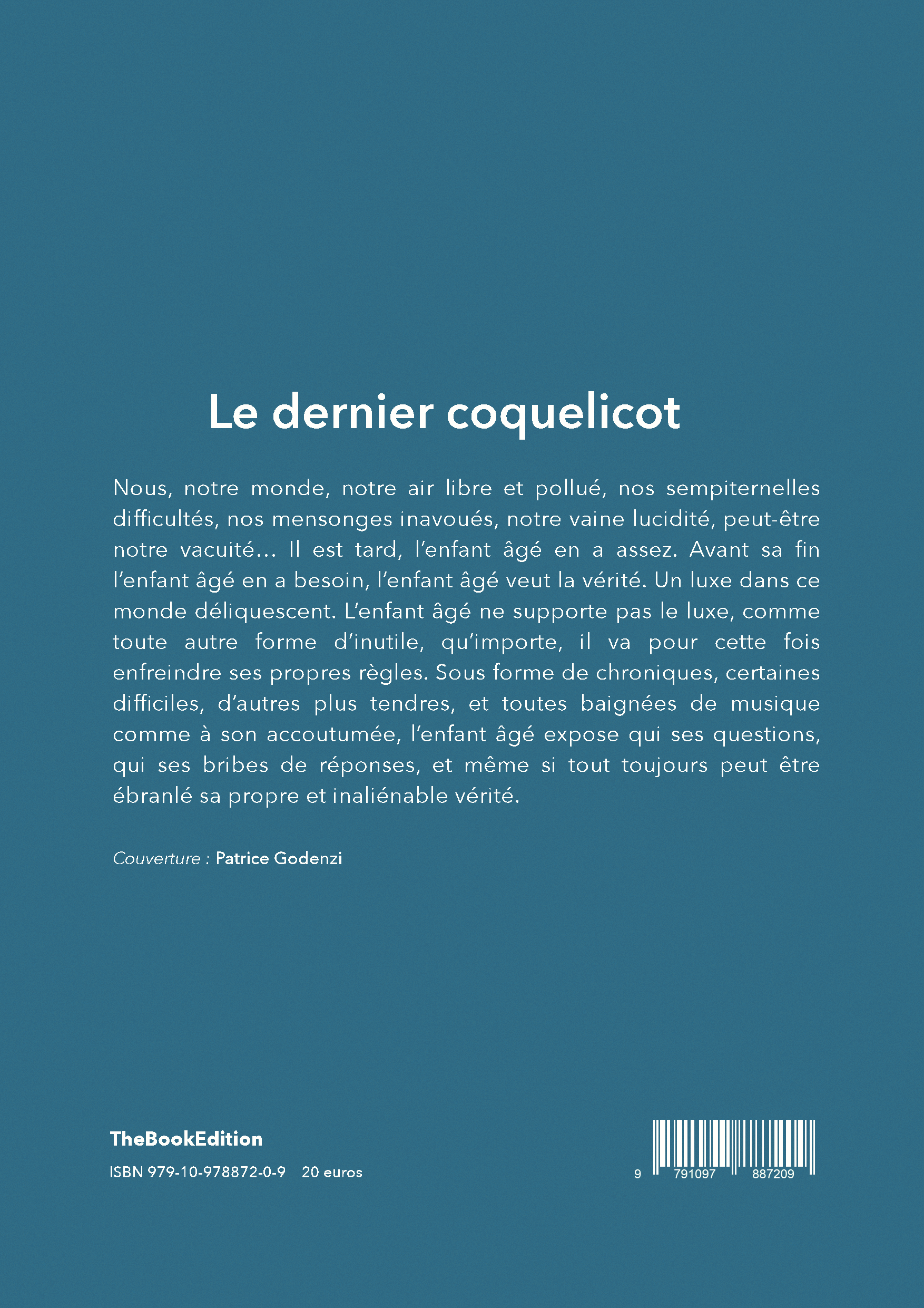 Nous, notre monde, notre air libre et pollué, nos sempiternelles difficultés, nos mensonges inavoués, notre vaine lucidité, peut-être notre vacuité… Il est tard, l’enfant âgé en a assez. Avant sa fin l’enfant âgé en a besoin, l’enfant âgé veut la vérité. Un luxe dans ce monde déliquescent. L’enfant âgé ne supporte pas le luxe, comme toute autre forme d’inutile, qu’importe, il va pour cette fois enfreindre ses propres règles. Sous forme de chroniques, certaines difficiles, d’autres plus tendres, et toutes baignées de musique comme à son accoutumée, l’enfant âgé expose qui ses questions, qui ses bribes de réponses, et même si tout toujours peut être ébranlé sa propre et inaliénable vérité.