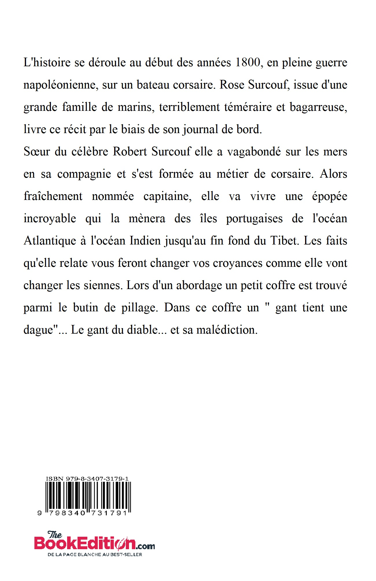 Pour se former au métier de corsaire, elle a vagabondé sur les mers en compagnie de son célèbre frère Robert. Fraîchement nommée capitaine, elle va vivre une épopée incroyable qui la mènera des îles portugaises de l'océan Atlantique à l'océan Indien jusqu'au fin fond du Tibet. Les faits qu'elle relate vous feront changer vos croyances comme elle vont changer les siennes. Lors d'un abordage un petit coffre est trouvé parmi le butin de pillage. Dans ce coffre un " gant tient une dague"... Le gant du diable... et sa malédiction.
