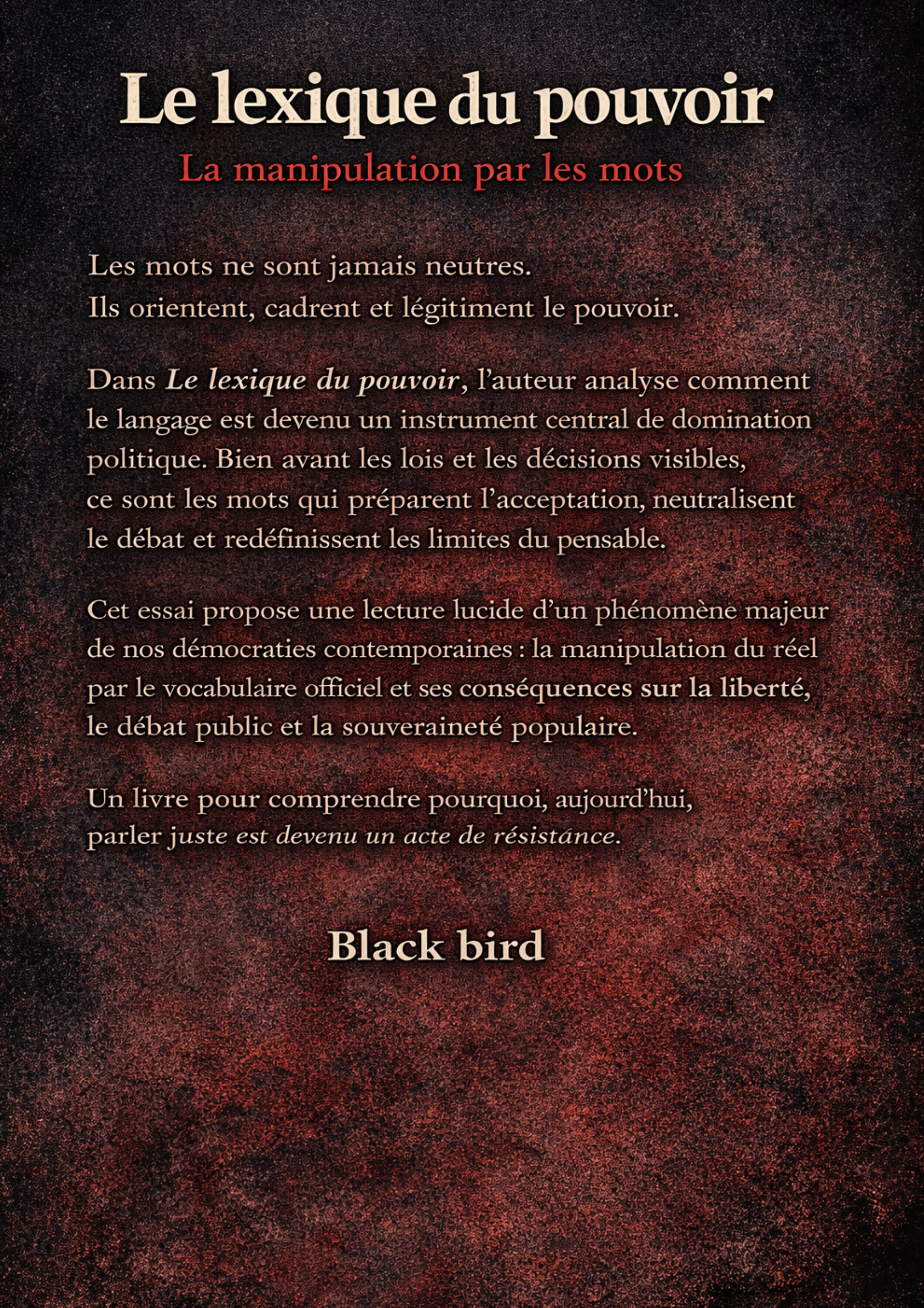 Dans Le lexique du pouvoir, l’auteur analyse comment le langage est devenu un instrument central de domination politique. Bien avant les lois et les décisions visibles, ce sont les mots qui préparent l’acceptation, neutralisent le débat et redéfinissent les limites du pensable.