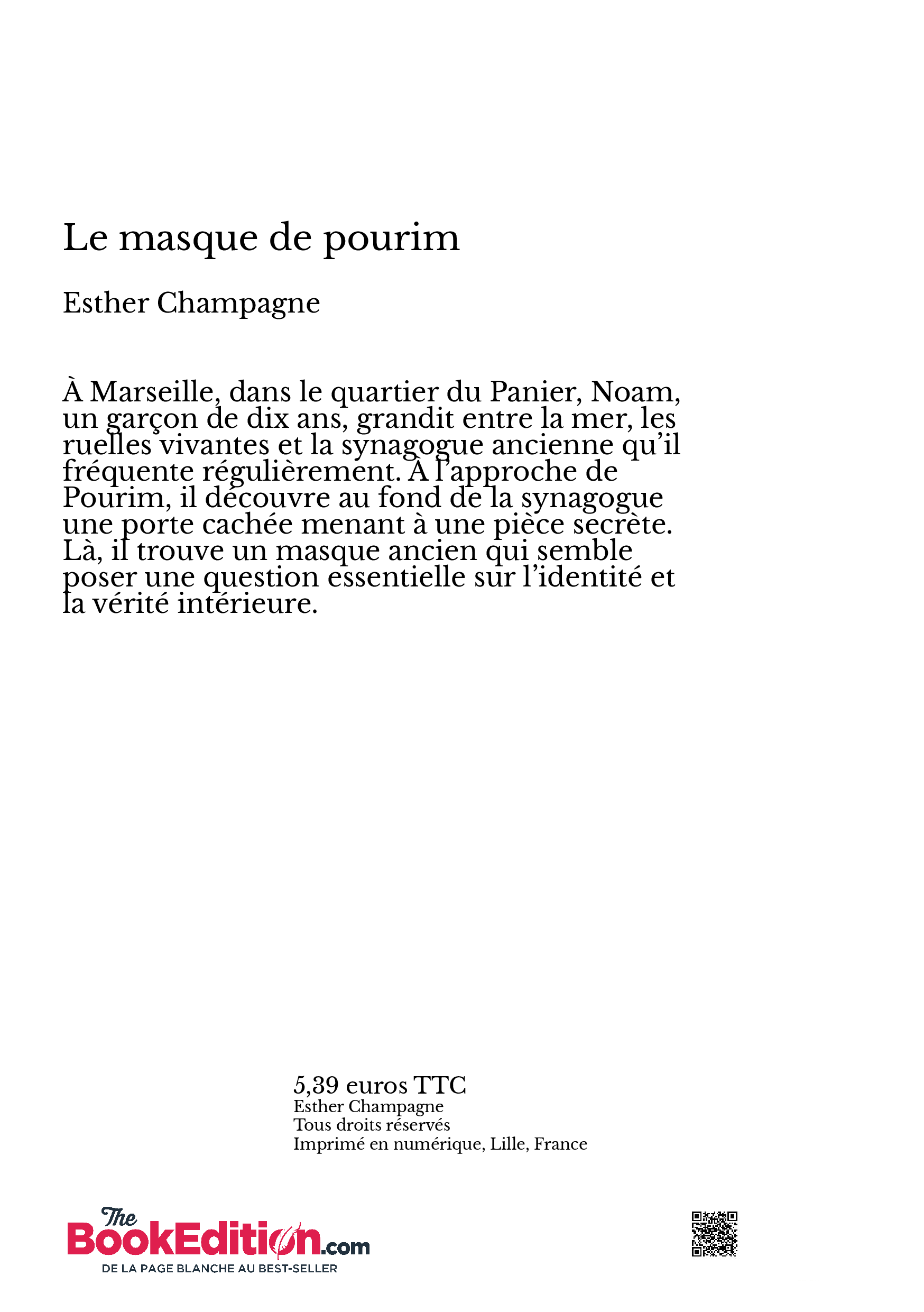 À Marseille, dans le quartier du Panier, Noam, un garçon de dix ans, grandit entre la mer, les ruelles vivantes et la synagogue ancienne qu’il fréquente régulièrement. À l’approche de Pourim, il découvre au fond de la synagogue une porte cachée menant à une pièce secrète. Là, il trouve un masque ancien qui semble poser une question essentielle sur l’identité et la vérité intérieure.