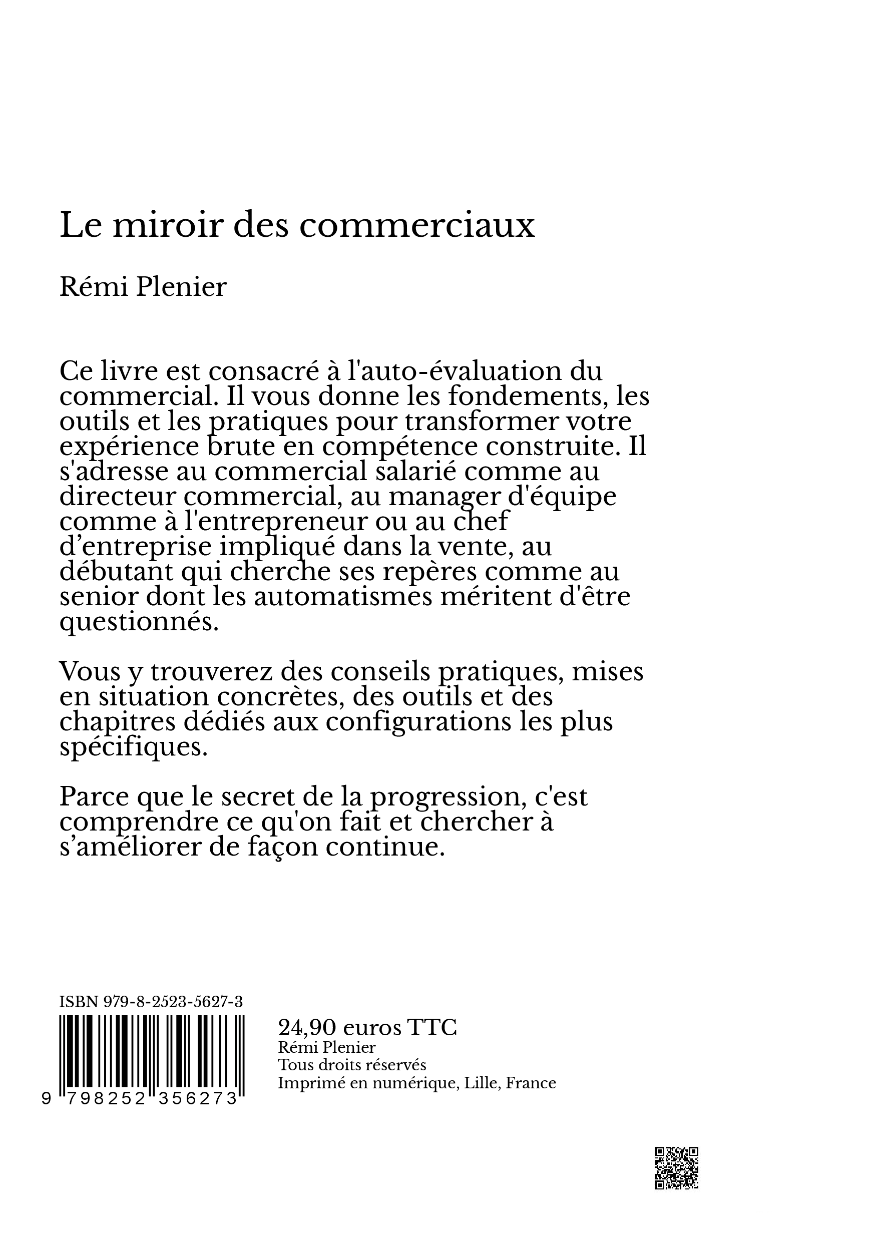 Ce livre est consacré à l'auto-évaluation du commercial. Il vous donne les fondements, les outils et les pratiques pour transformer votre expérience brute en compétence construite. Il s'adresse au commercial salarié comme au directeur commercial, au manager d'équipe comme à l'entrepreneur ou au chef d’entreprise impliqué dans la vente, au débutant qui cherche ses repères comme au senior dont les automatismes méritent d'être questionnés.