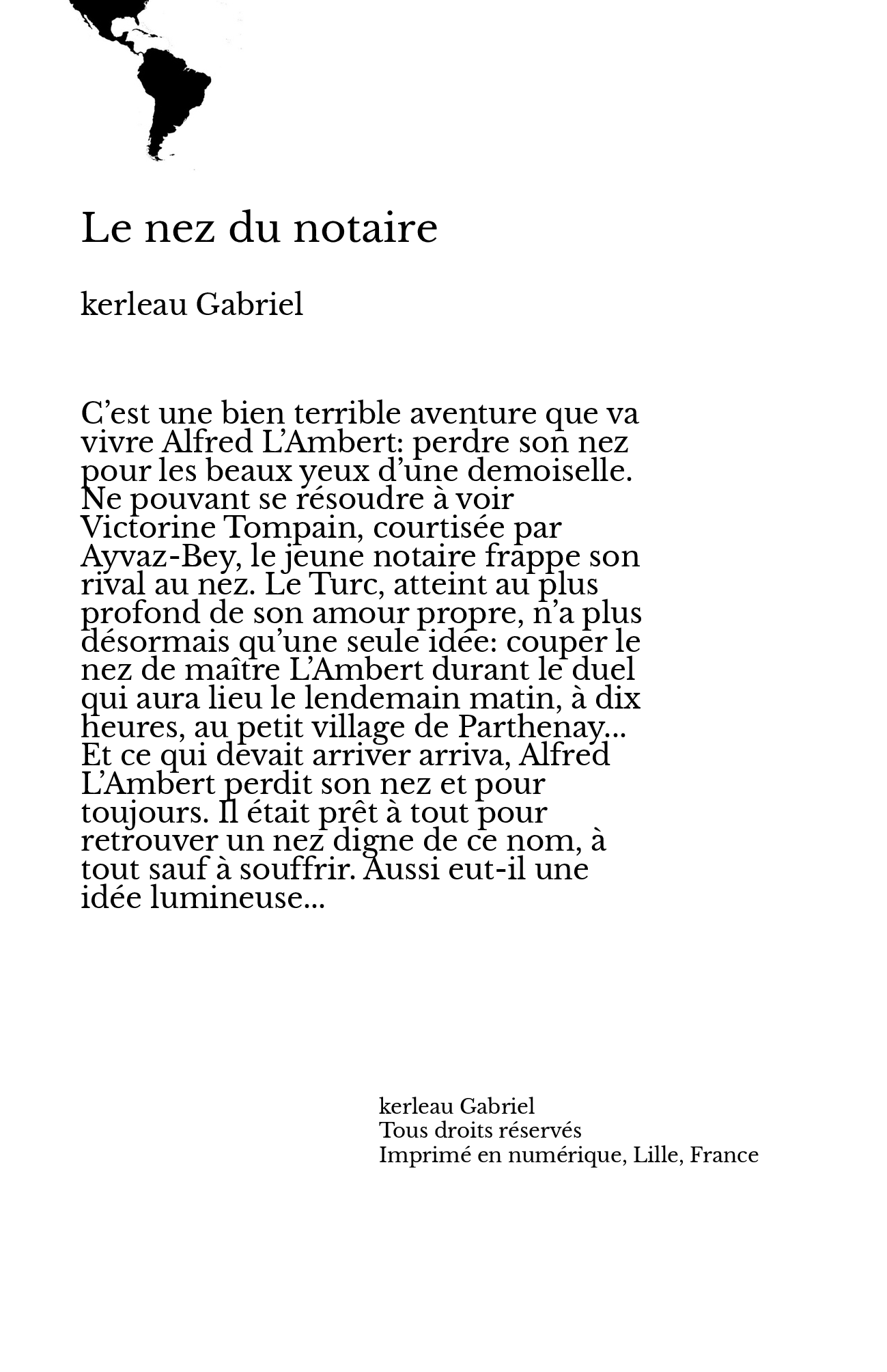 C’est une bien terrible aventure que va vivre Alfred L’Ambert: perdre son nez pour les beaux yeux d’une demoiselle. Ne pouvant se résoudre à voir Victorine Tompain, courtisée par Ayvaz-Bey, le jeune notaire frappe son rival au nez. Le Turc, atteint au plus profond de son amour propre, n’a plus désormais qu’une seule idée: couper le nez de maître L’Ambert durant le duel qui aura lieu le lendemain matin, à dix heures, au petit village de Parthenay... Et ce qui devait arriver arriva, Alfred L’Ambert perdit son nez et pour toujours. Il était prêt à tout pour retrouver un nez digne de ce nom, à tout sauf à souffrir. Aussi eut-il une idée lumineuse...