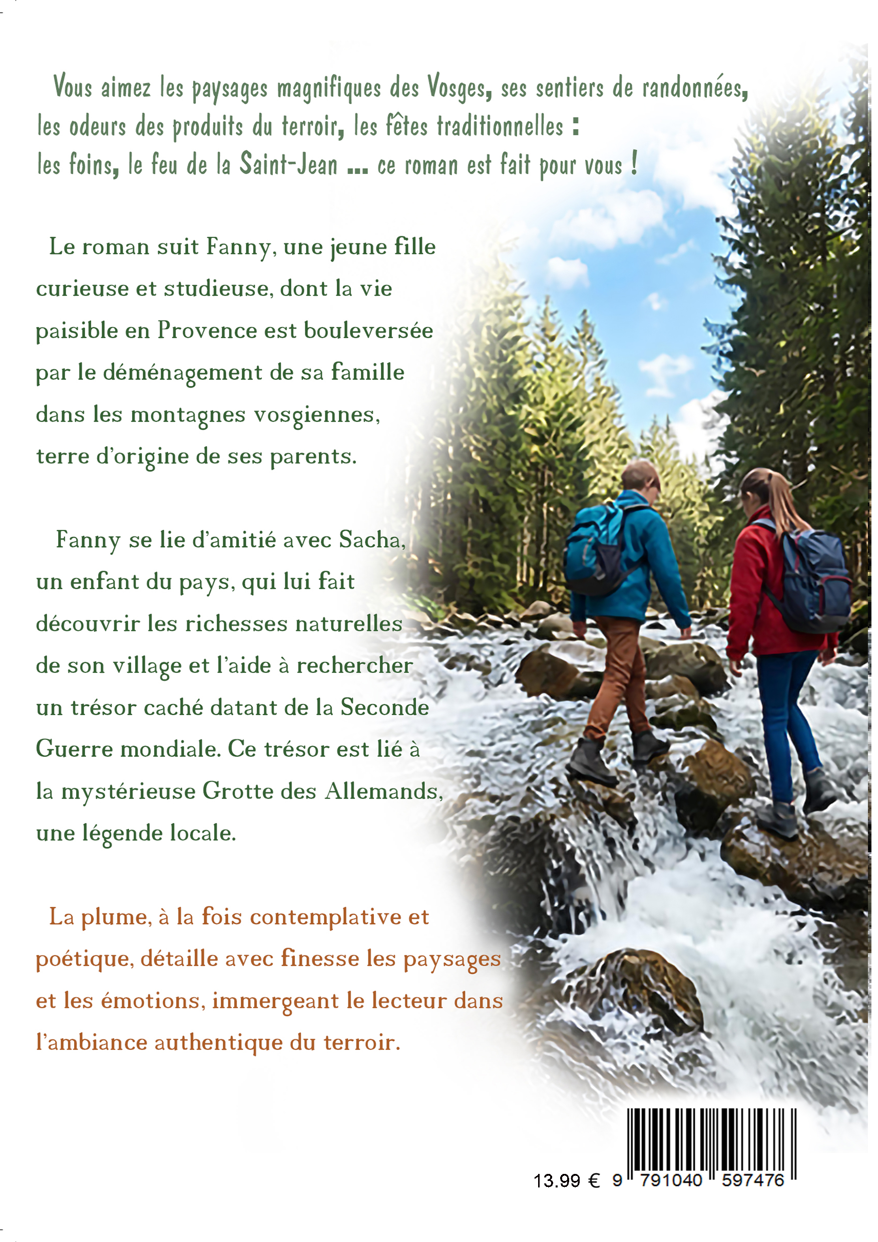 Vous aimez les Vosges, ses paysages, ses randonnées et les rêveries qu’elles inspirent ? Ce roman est fait pour vous ! Suivez Fanny, jeune fille curieuse : de la Provence sereine aux montagnes vosgiennes, elle affronte nostalgie et émerveillement. Forêts, rivières, villages... et une quête de trésor nazi qui la mène à Sacha, enfant du pays qui lui fait partager son univers naturel. Fanny grandit en s’émerveillant des nouveautés et en apprenant les valeurs de courage, de respect et de solidarité. Ce roman est un hymne à la vie simple, une ode lumineuse et authentique, où chaque instant invite à la rêverie et à la découverte, dans un environnement où l’homme et la nature vivent en harmonie.