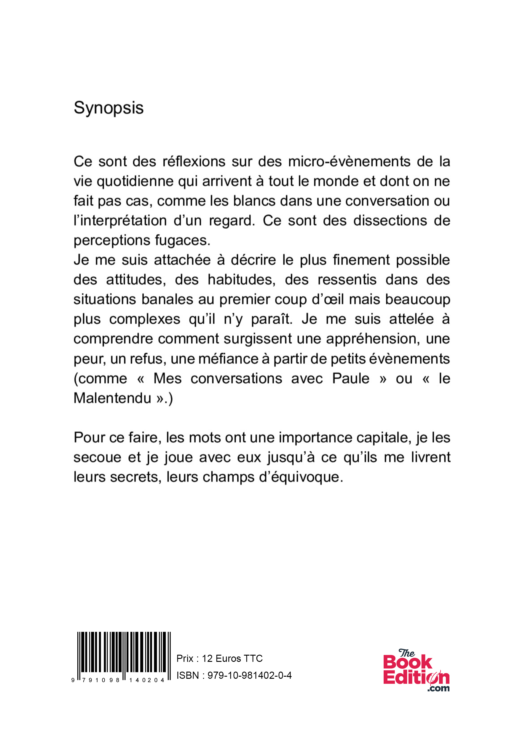 Ces chroniques sont le fruit d’observations minutieuses et de réflexions sur des micro-évènements du quotidien : des silences dans une conversation, l’interprétation d’un regard ou encore la manière dont surgissent les émotions à partir de situations apparemment anodines. Chaque texte dissèque des perceptions fugaces, cherchant à comprendre comment naissent une appréhension, une peur, un refus ou une méfiance à partir de petits détails de la vie, comme dans « Mes conversations avec Paule » ou « Le Malentendu ». Les mots sont ici chahutés, interrogés, jusqu’à ce qu’ils livrent leurs secrets et leurs zones d’ambiguïté. L’humour est partout présent dans ces récits, où chaque chronique constitue un univers en soi.