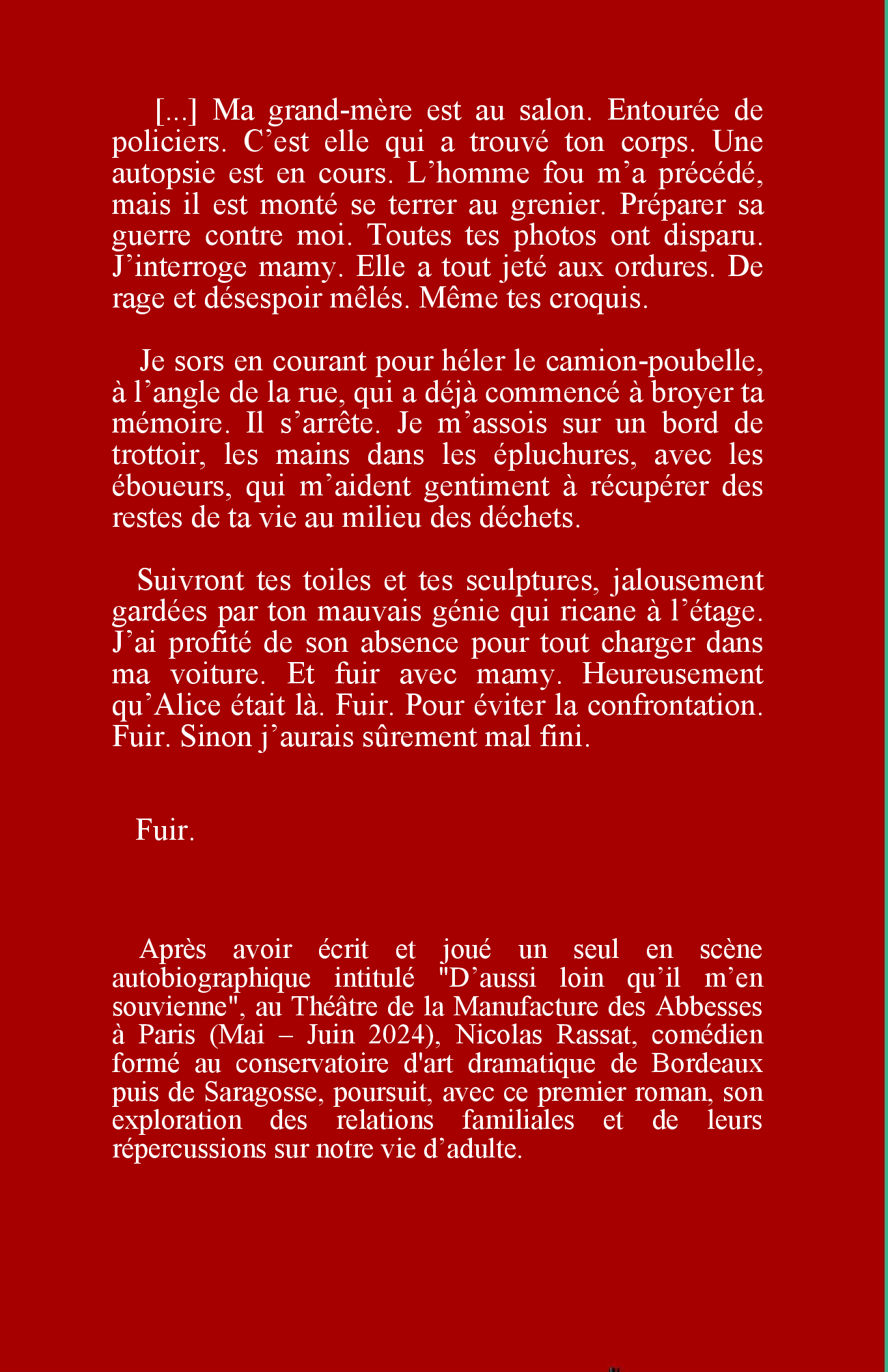 Il ne sera question ici que d’allers-retours dans la trompeuse mémoire de l’enfance, mêlant moments lumineux et zones d’ombres en un patchwork parfois si déroutant, qu’elle exclut toute linéarité et nécessite seulement d’être attentif aux évènements qu’elle veut bien nous livrer au compte-goutte. Il ne s’agit pourtant au final que de raconter une banale histoire de famille, dénuée de tout évènement spectaculaire. Avec plutôt l’objectif d’en étudier les mécanismes ordinaires, qui mènent insidieusement aux drames du quotidien. Ceux que nous portons ensuite sur nos épaules, sans trop savoir d’où ils sont nés, et qui finissent par nous constituer, telle une ligne de vie tracée de force dans notre paume ouverte.