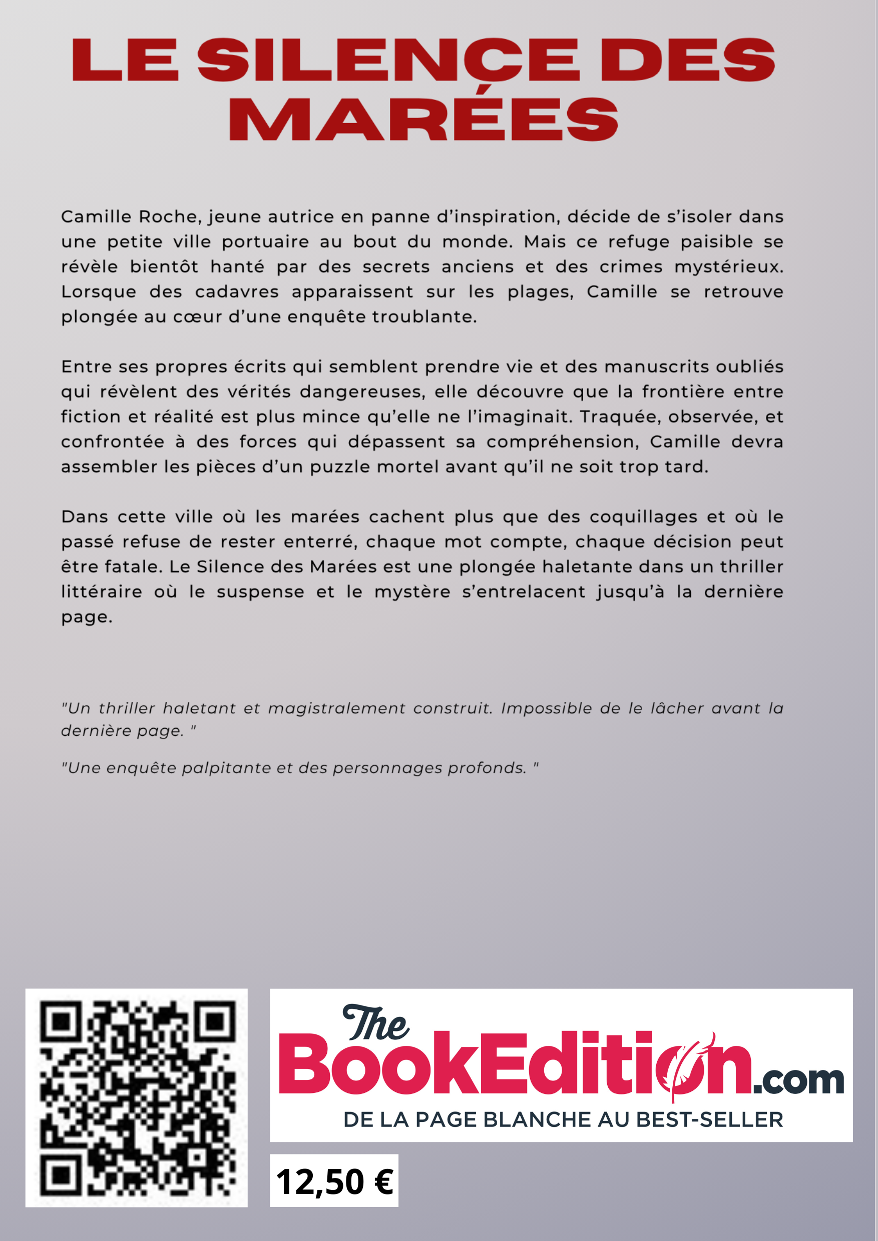 Le Silence des Marées est un thriller envoûtant qui nous entraîne au cœur d’une enquête où le mystère s’entrelace avec les émotions humaines les plus profondes. Dès les premières pages, on est happé par l’atmosphère étrange et presque hypnotique de ce village côtier où chaque silence semble cacher un secret.