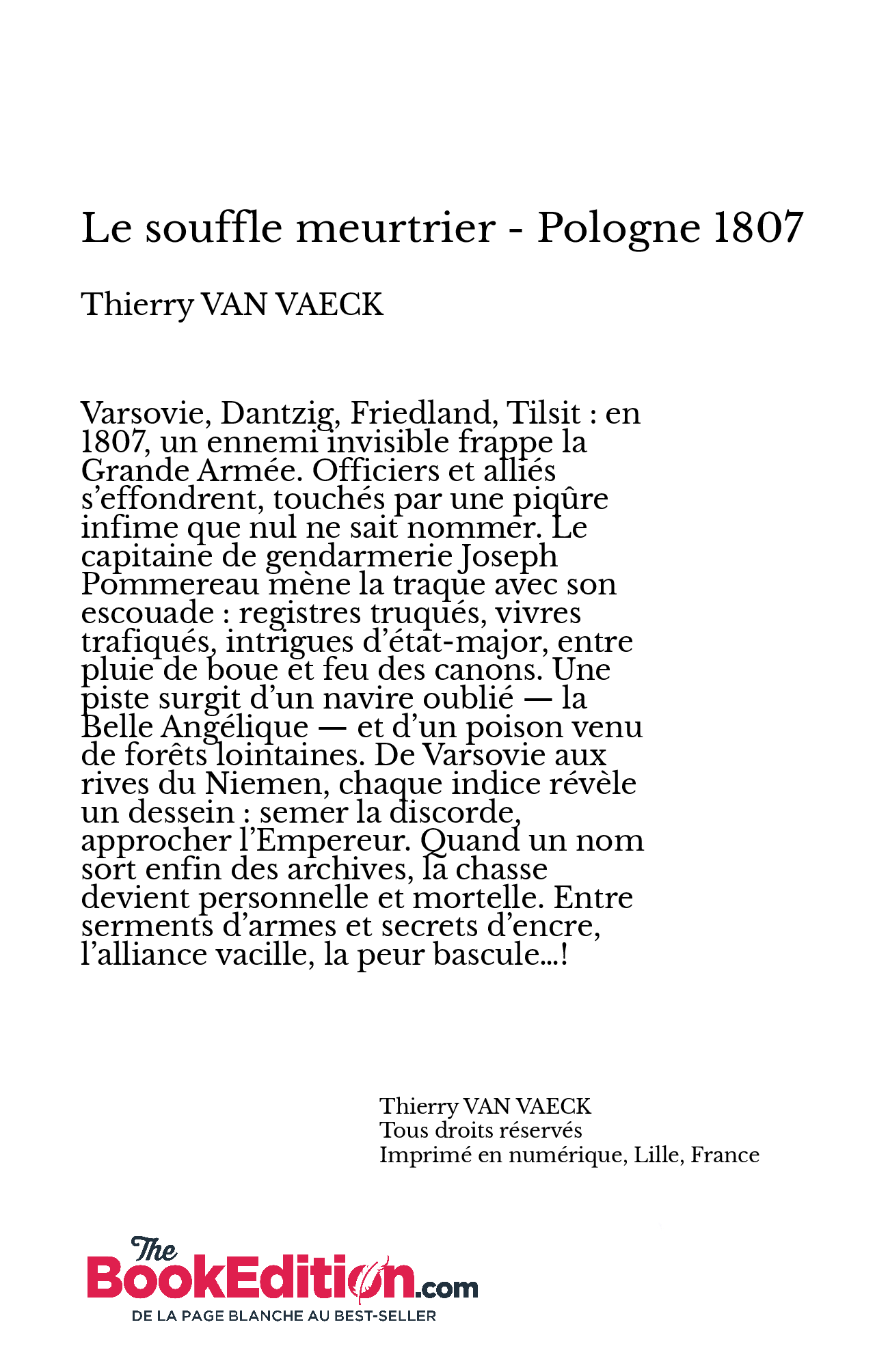 Varsovie, Dantzig, Friedland, Tilsit : en 1807, un ennemi invisible frappe la Grande Armée. Officiers et alliés s’effondrent, touchés par une piqûre infime que nul ne sait nommer. Le capitaine de gendarmerie Joseph Pommereau mène la traque avec son escouade : registres truqués, vivres trafiqués, intrigues d’état-major, entre pluie de boue et feu des canons. Une piste surgit d’un navire oublié — la Belle Angélique — et d’un poison venu de forêts lointaines. De Varsovie aux rives du Niemen, chaque indice révèle un dessein : semer la discorde, approcher l’Empereur. Quand un nom sort enfin des archives, la chasse devient personnelle et mortelle. Entre serments d’armes et secrets d’encre, l’alliance vacille, la peur bascule…!