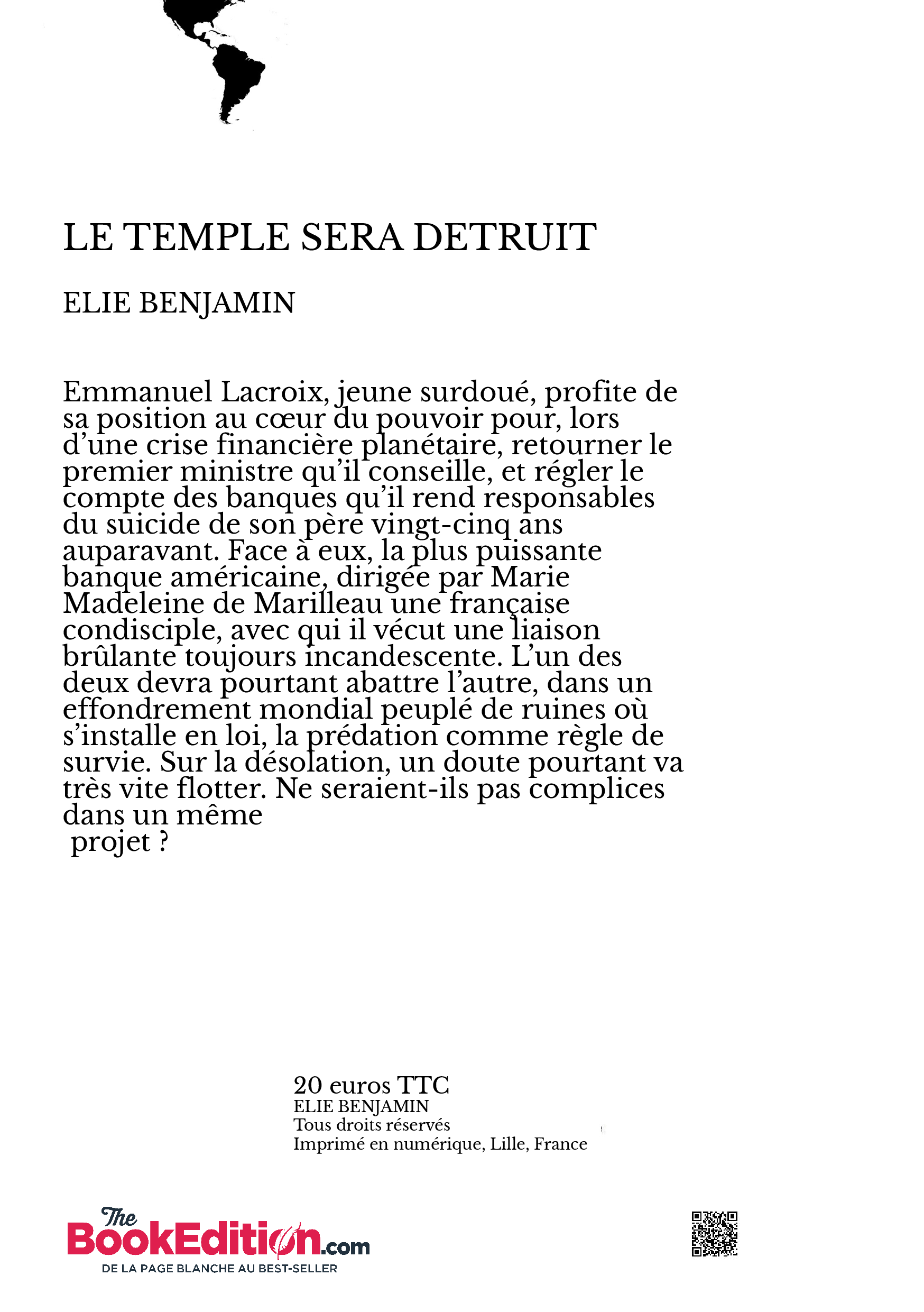 Emmanuel Lacroix, jeune surdoué, profite de sa position au cœur du pouvoir pour, lors d’une crise financière planétaire, retourner le premier ministre qu’il conseille, et régler le compte des banques qu’il rend responsables du suicide de son père vingt-cinq ans auparavant. Face à eux, la plus puissante banque américaine, dirigée par Marie Madeleine de Marilleau une française condisciple, avec qui il vécut une liaison brûlante toujours incandescente. L’un des deux devra pourtant abattre l’autre, dans un effondrement mondial peuplé de ruines où s’installe en loi, la prédation comme règle de survie. Sur la désolation, un doute pourtant va très vite flotter. Ne seraient-ils pas complices dans un même