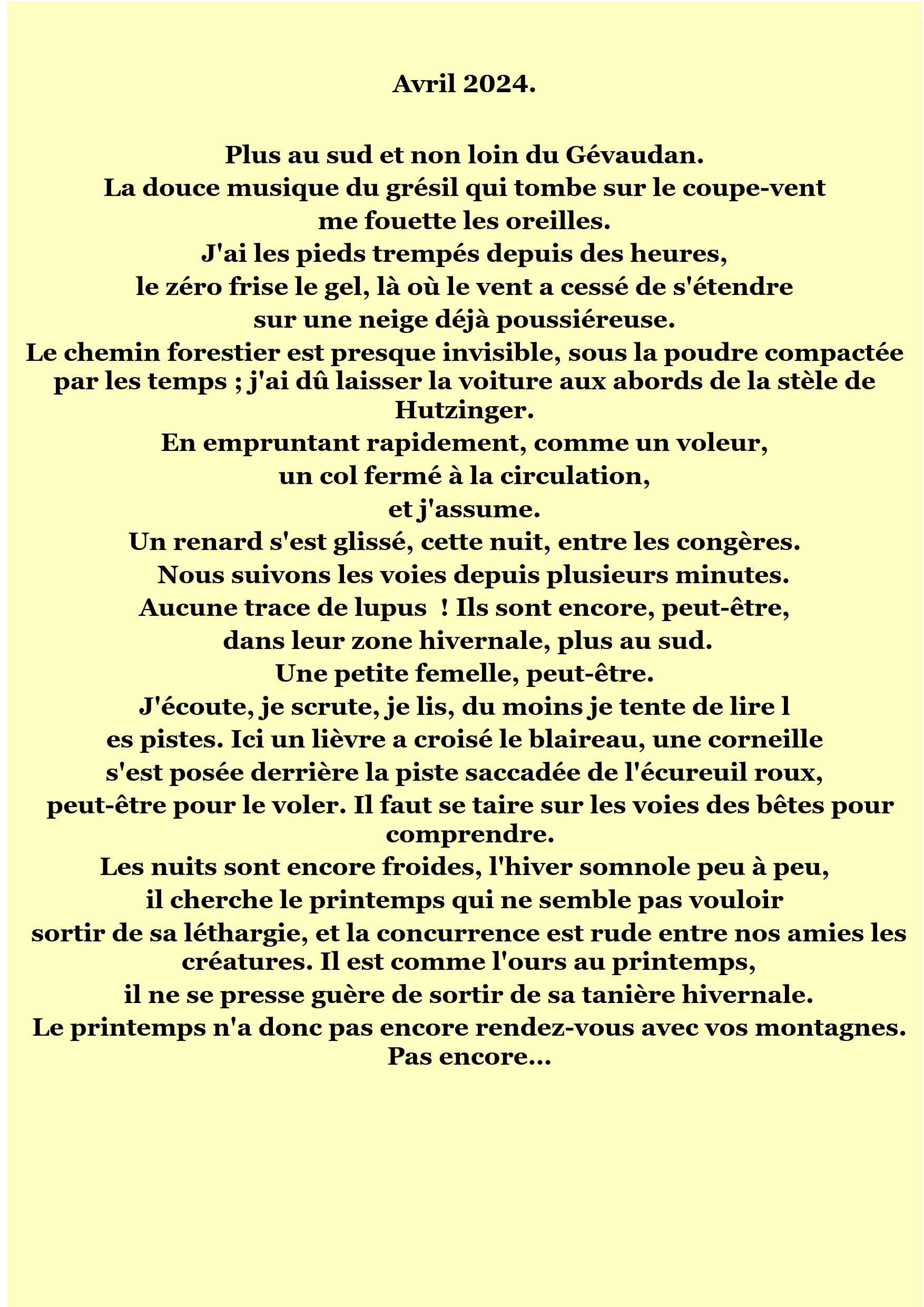 La marche vers l'océan, des Cévennes vers l'Atlantique nous mène des contrées sauvages du Gard, au Gévaudan, face au Massif central, vers les aires d'attente solognotes où le chacal doré, suit le loup à la trace. Jusqu'aux reproductions des prédateurs totalement niées par les « agents », dans l'Ouest de la France !