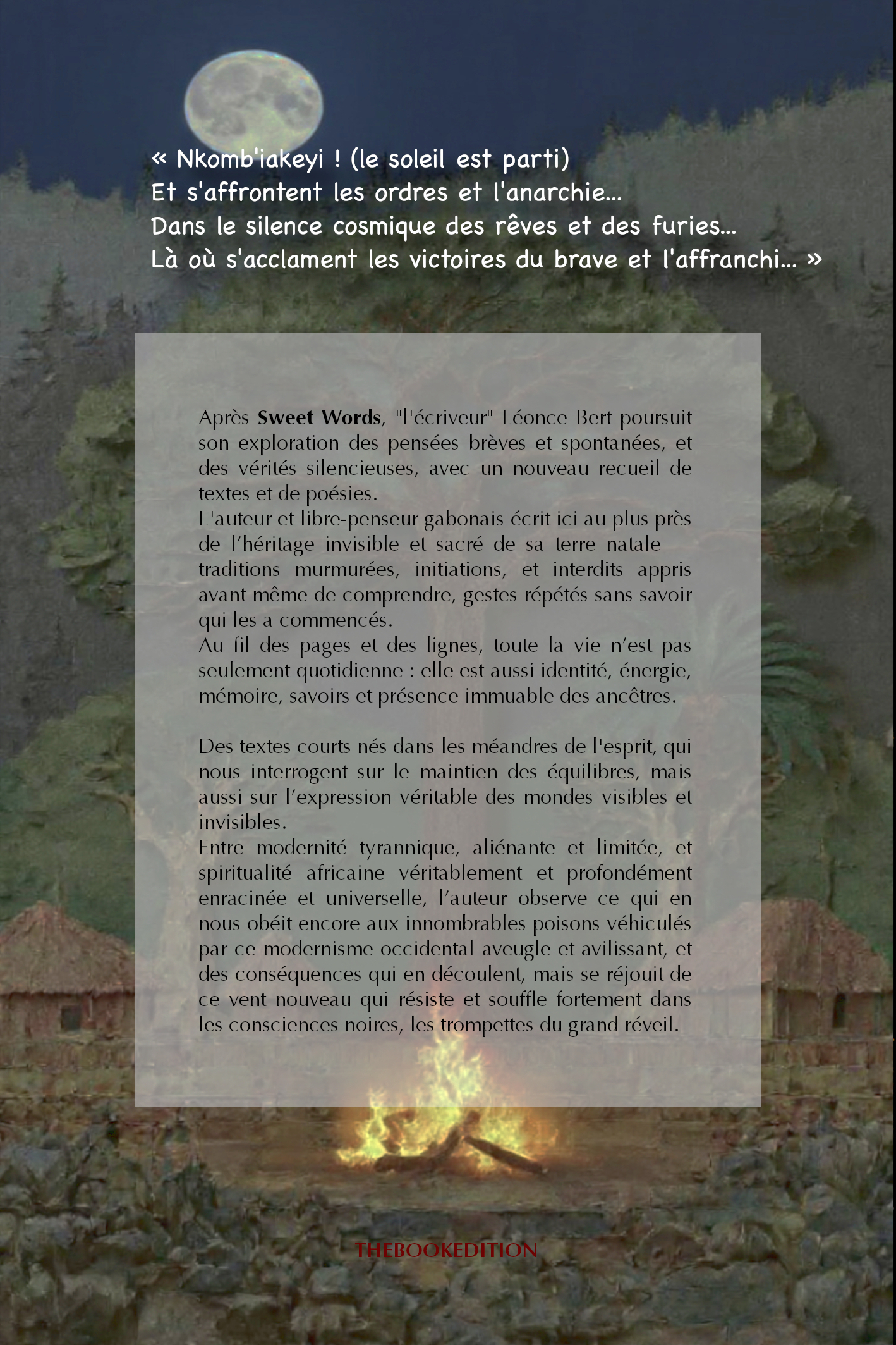 Entre modernité tyrannique, aliénante et limitée, et spiritualité africaine véritablement et profondément enracinée et universelle, l’auteur observe ce qui en nous obéit encore aux innombrables poisons véhiculés par ce modernisme aveugle, et des conséquences qui en découlent, mais se réjouit de ce vent nouveau qui résiste, et souffle dans les consciences noires les trompettes du grand réveil.