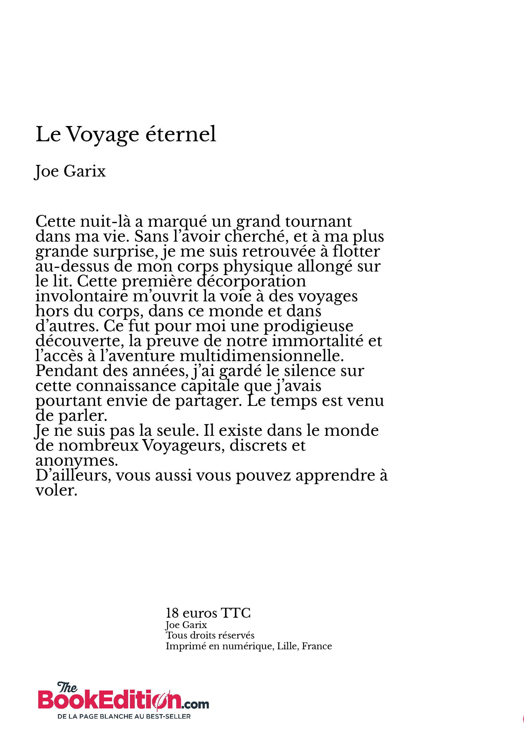 Cette nuit-là a marqué un grand tournant dans ma vie. Sans l’avoir cherché, et à ma plus grande surprise, je me suis retrouvée à flotter au-dessus de mon corps physique allongé sur le lit. Cette première décorporation involontaire m’ouvrit la voie à des voyages hors du corps, dans ce monde et dans d’autres. Ce fut pour moi une prodigieuse découverte, la preuve de notre immortalité et l’accès à l’aventure multidimensionnelle.