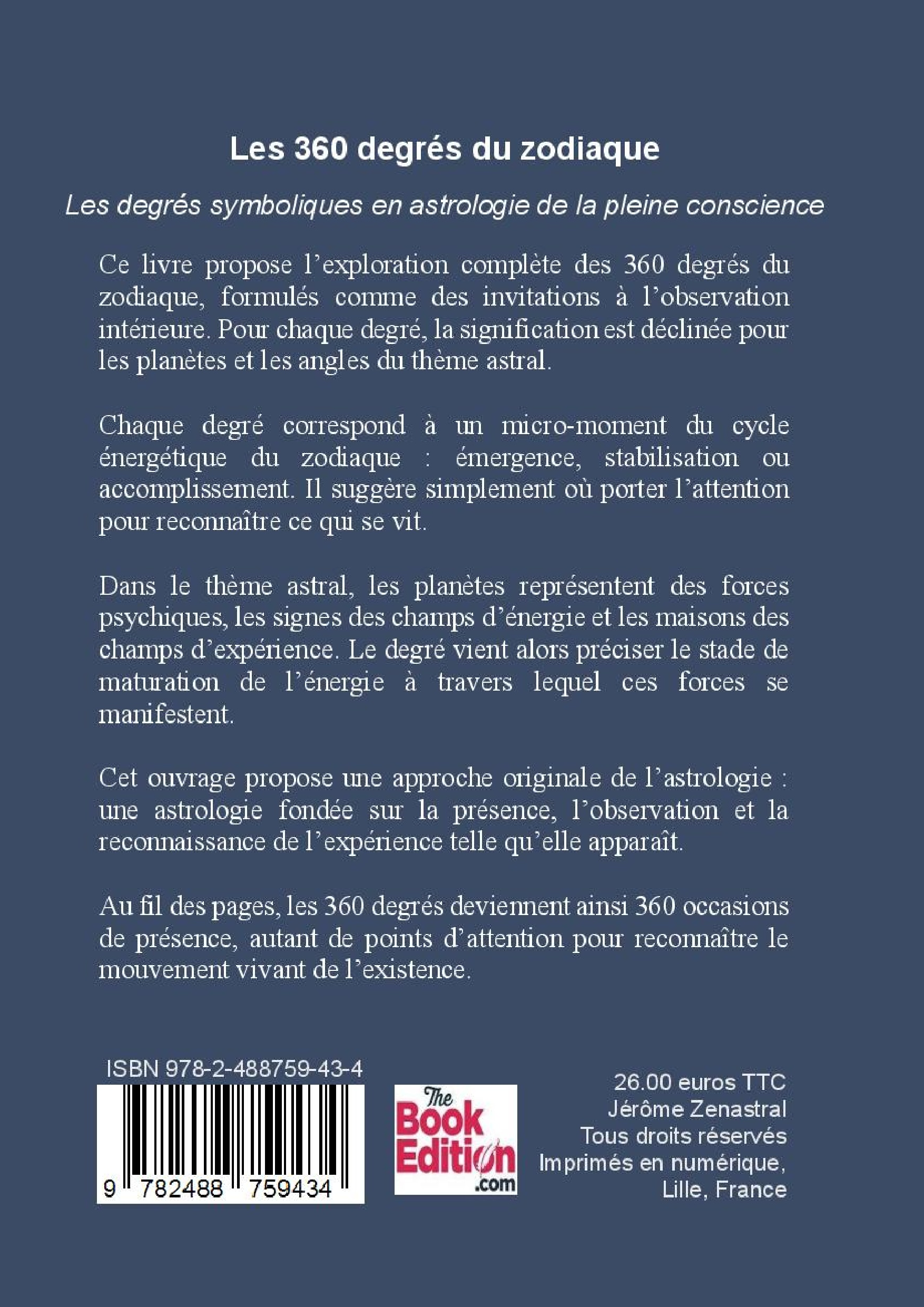 Ce livre explore les 360 degrés du zodiaque comme autant d’invitations à l’observation intérieure. Pour chaque degré, la signification est déclinée pour les planètes et les angles du thème astral.