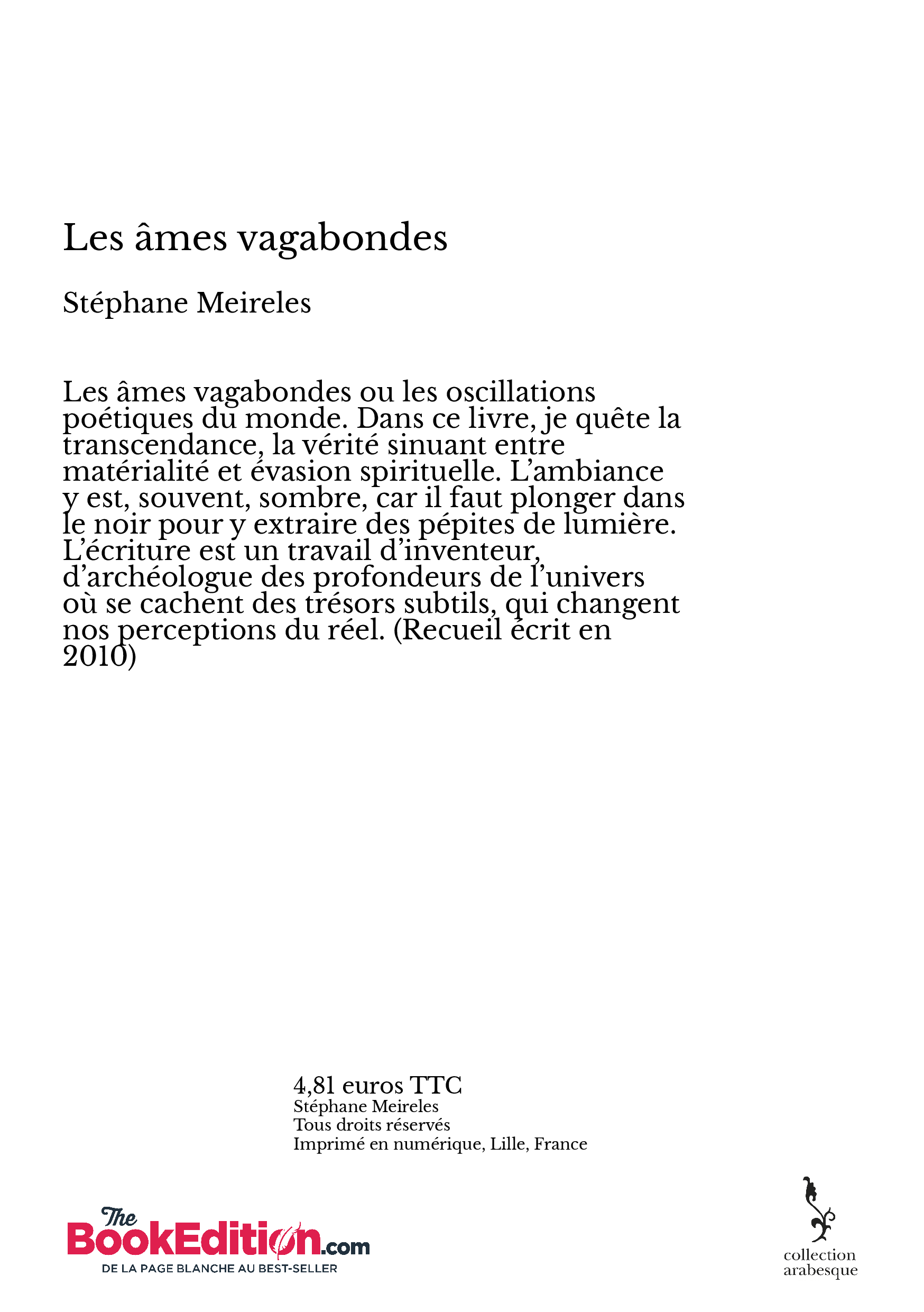 Les âmes vagabondes ou les oscillations poétiques du monde. Dans ce livre, je quête la transcendance, la vérité sinuant entre matérialité et évasion spirituelle. L’ambiance y est, souvent, sombre, car il faut plonger dans le noir pour y extraire des pépites de lumière. L’écriture est un travail d’inventeur, d’archéologue des profondeurs de l’univers où se cachent des trésors subtils, qui changent nos perceptions du réel. (Recueil écrit en 2010)