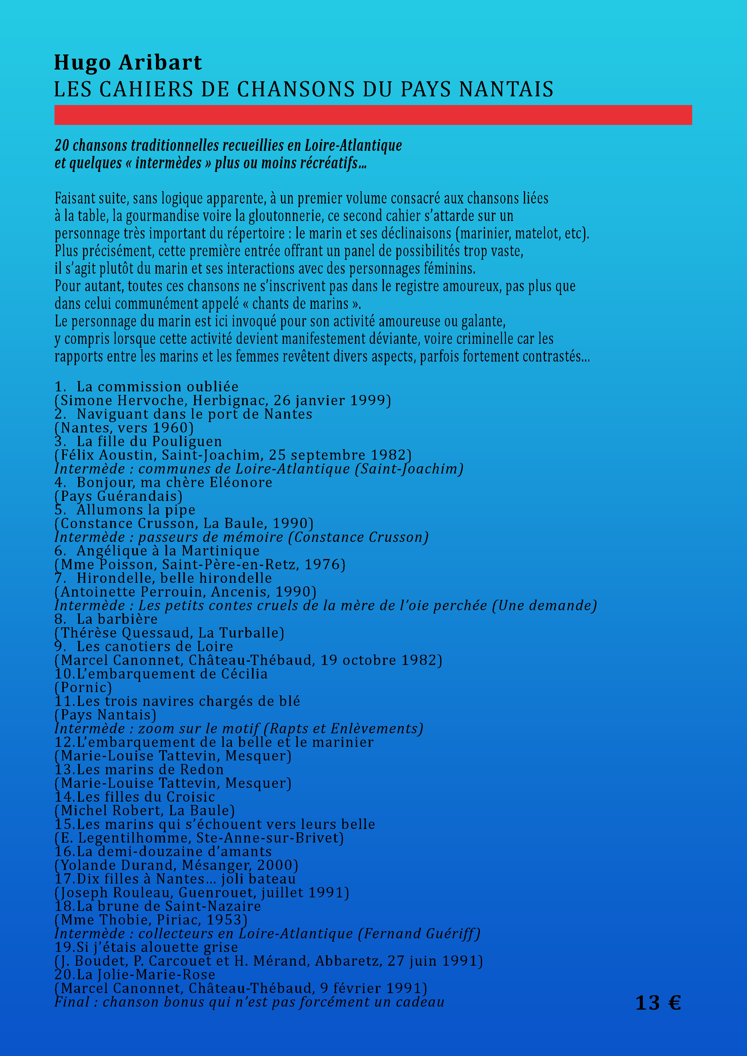 Faisant suite, sans logique apparente, à un premier volume consacré aux chansons liées à la table, ce second cahier s’attarde sur un personnage très important du répertoire : le marin.
