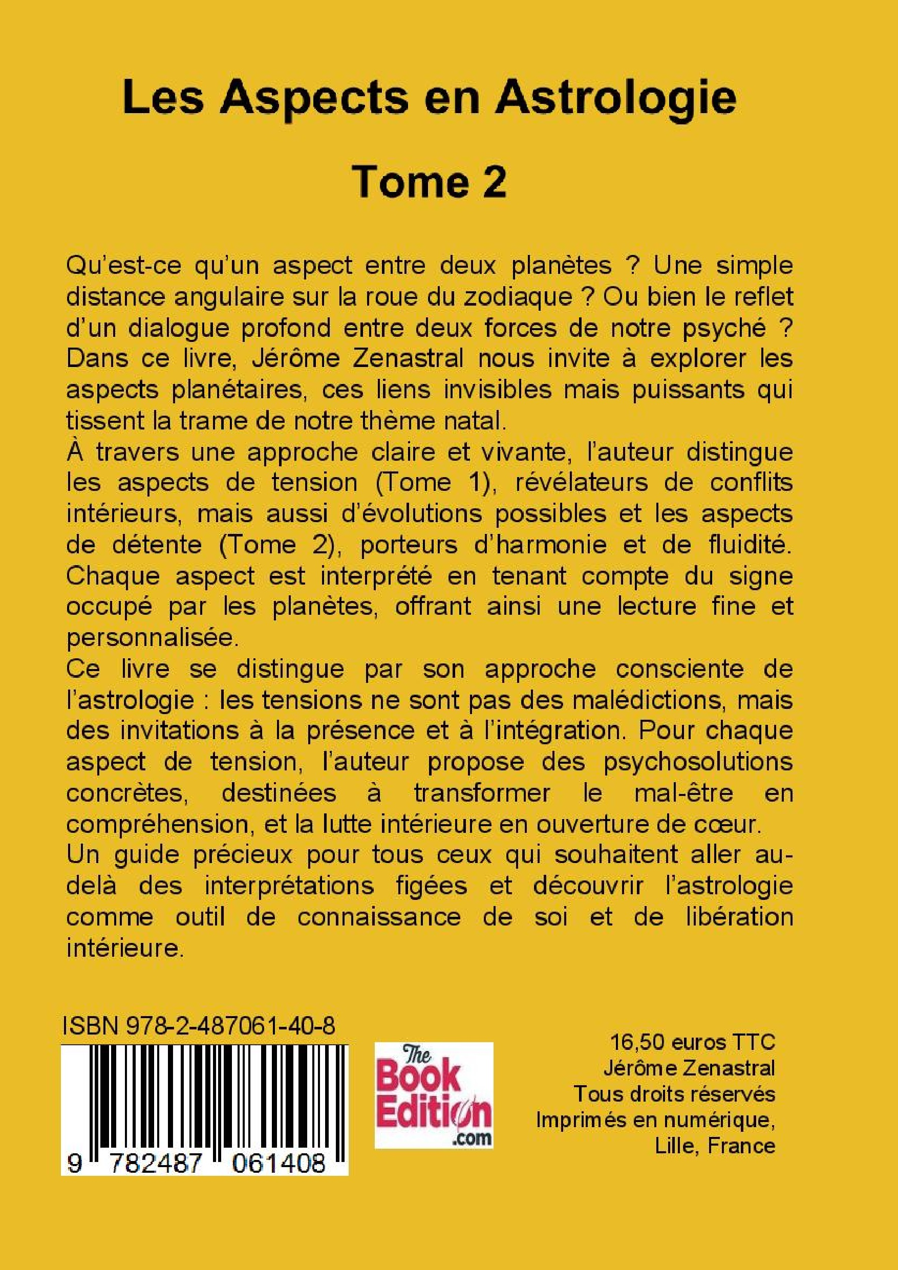 Dans ce livre, Jérôme Zenastral nous invite à explorer les aspects planétaires. À travers une approche claire et vivante, l’auteur distingue les aspects de tension (Tome 1), révélateurs de conflits intérieurs, mais aussi d’évolutions possibles et les aspects de détente (Tome 2), porteurs d’harmonie et de fluidité. Chaque aspect est interprété en tenant compte du signe occupé par les planètes, offrant ainsi une lecture fine et personnalisée. Pour chaque aspect, l’auteur propose des psychosolutions concrètes, destinées à transformer le mal-être en compréhension.