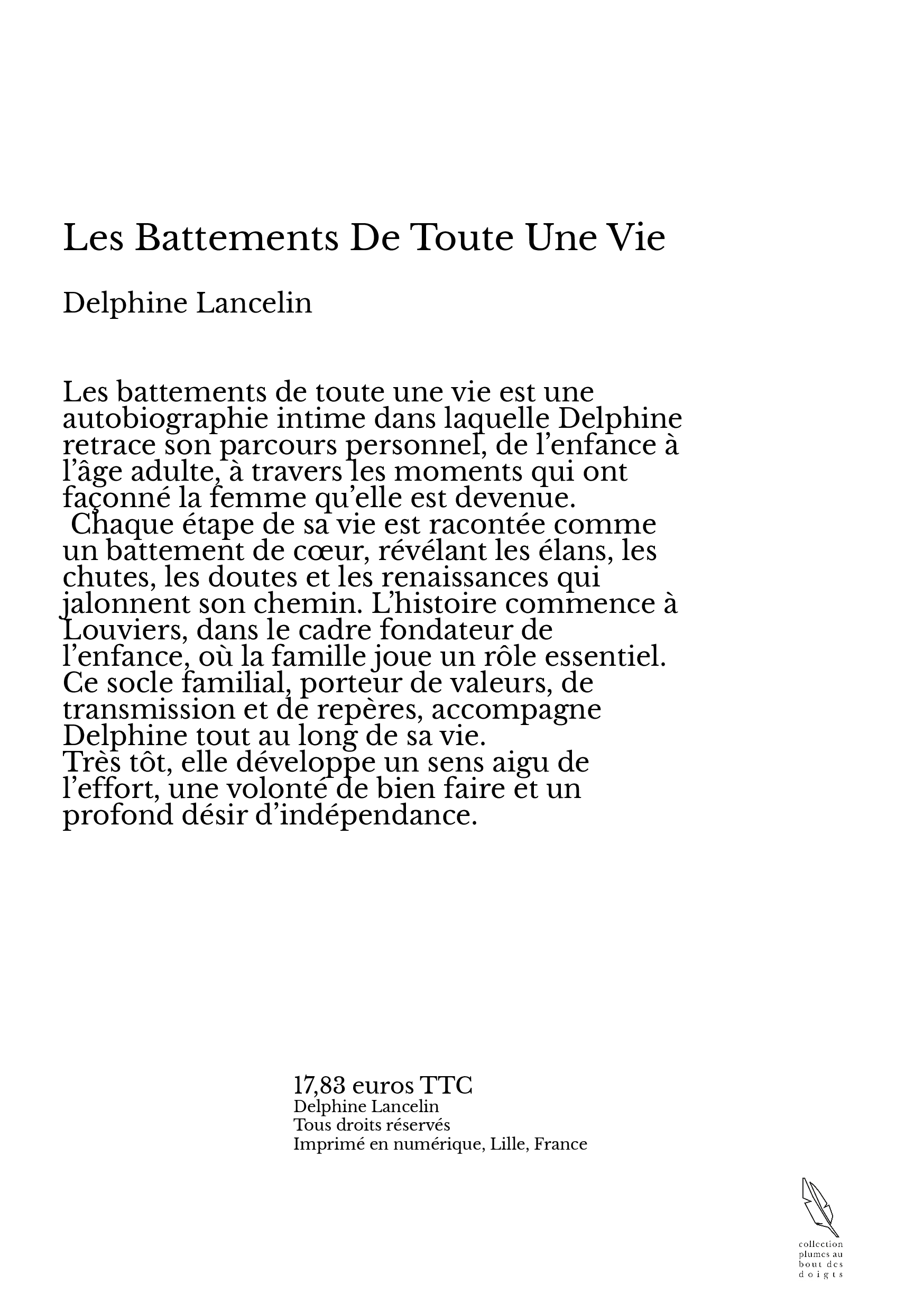 Les battements de toute une vie est une autobiographie intime dans laquelle Delphine retrace son parcours personnel, de l’enfance à l’âge adulte, à travers les moments qui ont façonné la femme qu’elle est devenue.