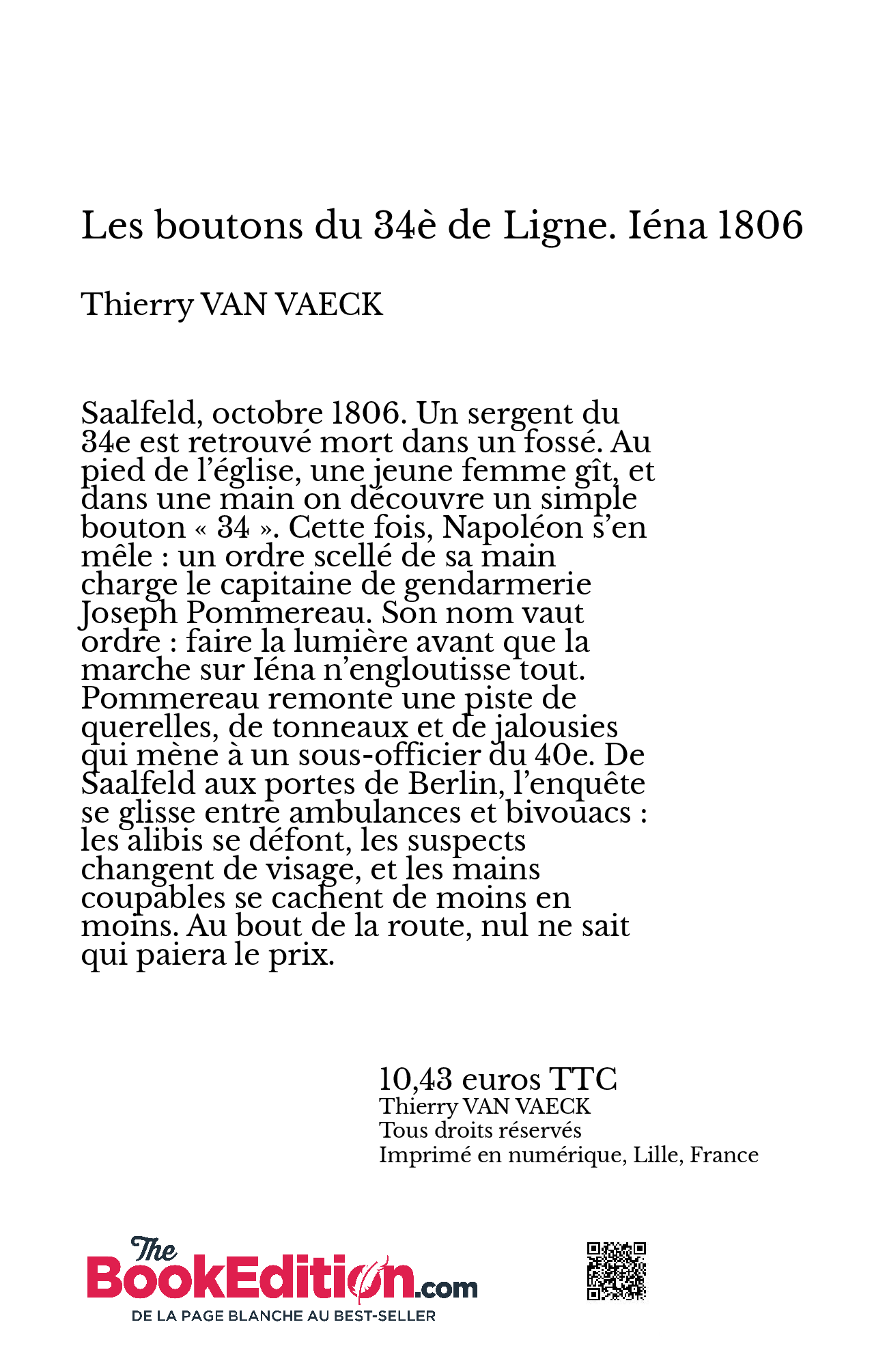 Saalfeld, octobre 1806. Un sergent du 34e est retrouvé mort dans un fossé. Au pied de l’église, une jeune femme gît, et dans une main on découvre un simple bouton « 34 ». Cette fois, Napoléon s’en mêle : un ordre scellé de sa main charge le capitaine de gendarmerie Joseph Pommereau. Son nom vaut ordre : faire la lumière avant que la marche sur Iéna n’engloutisse tout. Pommereau remonte une piste de querelles, de tonneaux et de jalousies qui mène à un sous-officier du 40e. De Saalfeld aux portes de Berlin, l’enquête se glisse entre ambulances et bivouacs : les alibis se défont, les suspects changent de visage, et les mains coupables se cachent de moins en moins. Au bout de la route, nul ne sait qui paiera le prix.