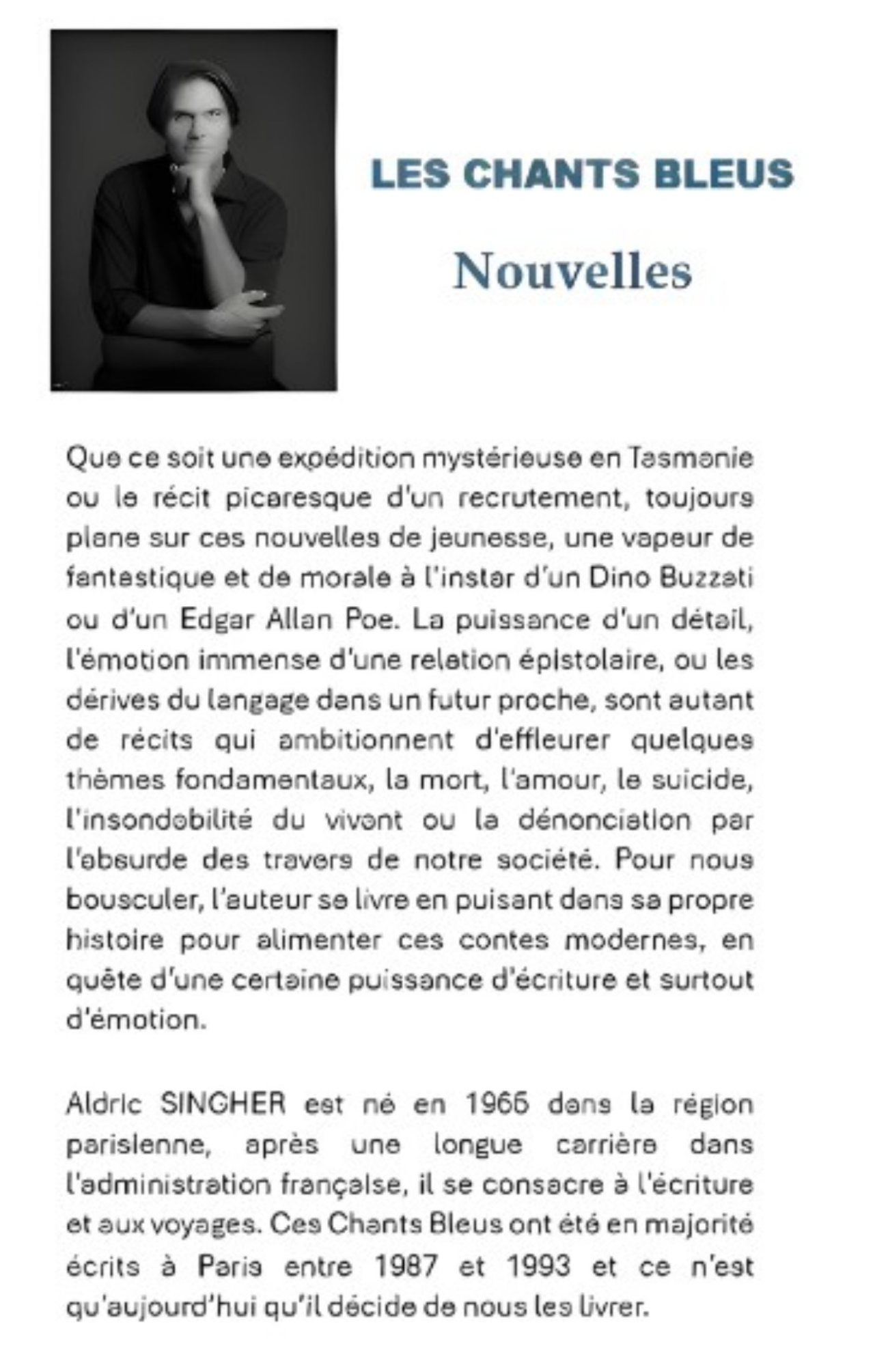 Que ce soit une expédition mystérieuse en Tasmanie ou le récit picaresque d’un recrutement, toujours plane sur ces nouvelles de jeunesse, une vapeur de fantastique et de morale à l’instar d’un Dino Buzzati ou d’un Edgar Allan Poe. La puissance d’un détail, l’émotion immense d’une relation épistolaire, ou les dérives du langage dans un futur proche, sont autant de récits qui ambitionnent d’effleurer quelques thèmes fondamentaux, la mort, l’amour, le suicide, l’insondabilité du vivant ou la dénonciation par l’absurde des travers de notre société. Pour nous bousculer, l’auteur se livre en puisant dans sa propre histoire pour alimenter ces contes modernes, en quête d’une certaine puissance d’écriture et surtout d’émotion.
