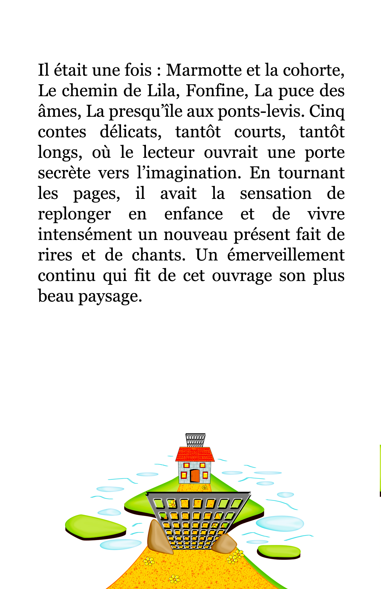 Il était une fois : Marmotte et la cohorte, Le chemin de Lila, Fonfine, La puce des âmes, La presqu’île aux ponts-levis. Cinq contes délicats, tantôt courts, tantôt longs, où le lecteur ouvrait une porte secrète vers l’imagination. En tournant les pages, il avait la sensation de replonger en enfance et de vivre intensément un nouveau présent fait de rires et de chants. Un émerveillement continu qui fit de cet ouvrage son plus beau paysage.