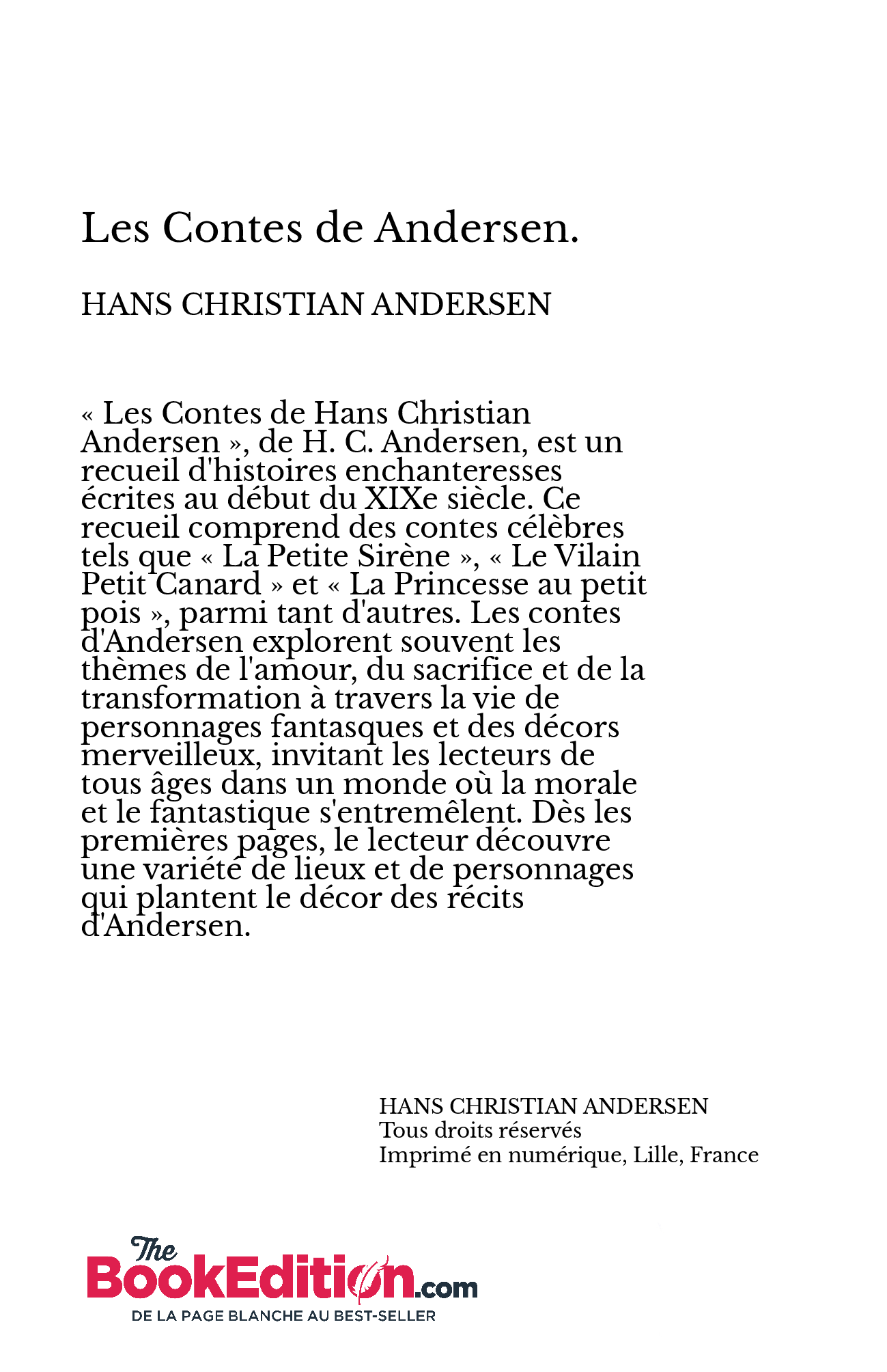 « Les Contes de Hans Christian Andersen », de H. C. Andersen, est un recueil d'histoires enchanteresses écrites au début du XIXe siècle. Ce recueil comprend des contes célèbres tels que « La Petite Sirène », « Le Vilain Petit Canard » et « La Princesse au petit pois », parmi tant d'autres. Les contes d'Andersen explorent souvent les thèmes de l'amour, du sacrifice et de la transformation à travers la vie de personnages fantasques et des décors merveilleux, invitant les lecteurs de tous âges dans un monde où la morale et le fantastique s'entremêlent. Dès les premières pages, le lecteur découvre une variété de lieux et de personnages qui plantent le décor des récits d'Andersen.