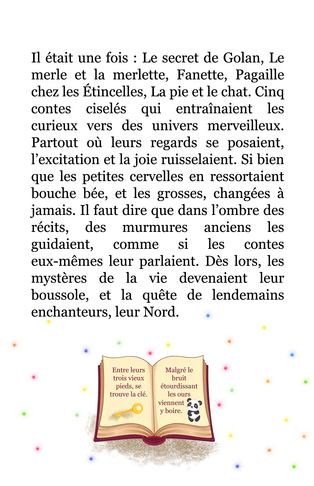 Il était une fois : Le secret de Golan, Le merle et la merlette, Fanette, Pagaille chez les Étincelles, La pie et le chat. Cinq contes ciselés qui entraînaient les curieux vers des univers merveilleux. Partout où leurs regards se posaient, l’excitation et la joie ruisselaient. Si bien que les petites cervelles en ressortaient bouche bée, et les grosses, changées à jamais. Il faut dire que dans l’ombre des récits, des murmures anciens les guidaient, comme si les contes eux-mêmes leur parlaient. Dès lors, les mystères de la vie devenaient leur boussole, et la quête de lendemains enchanteurs, leur Nord.