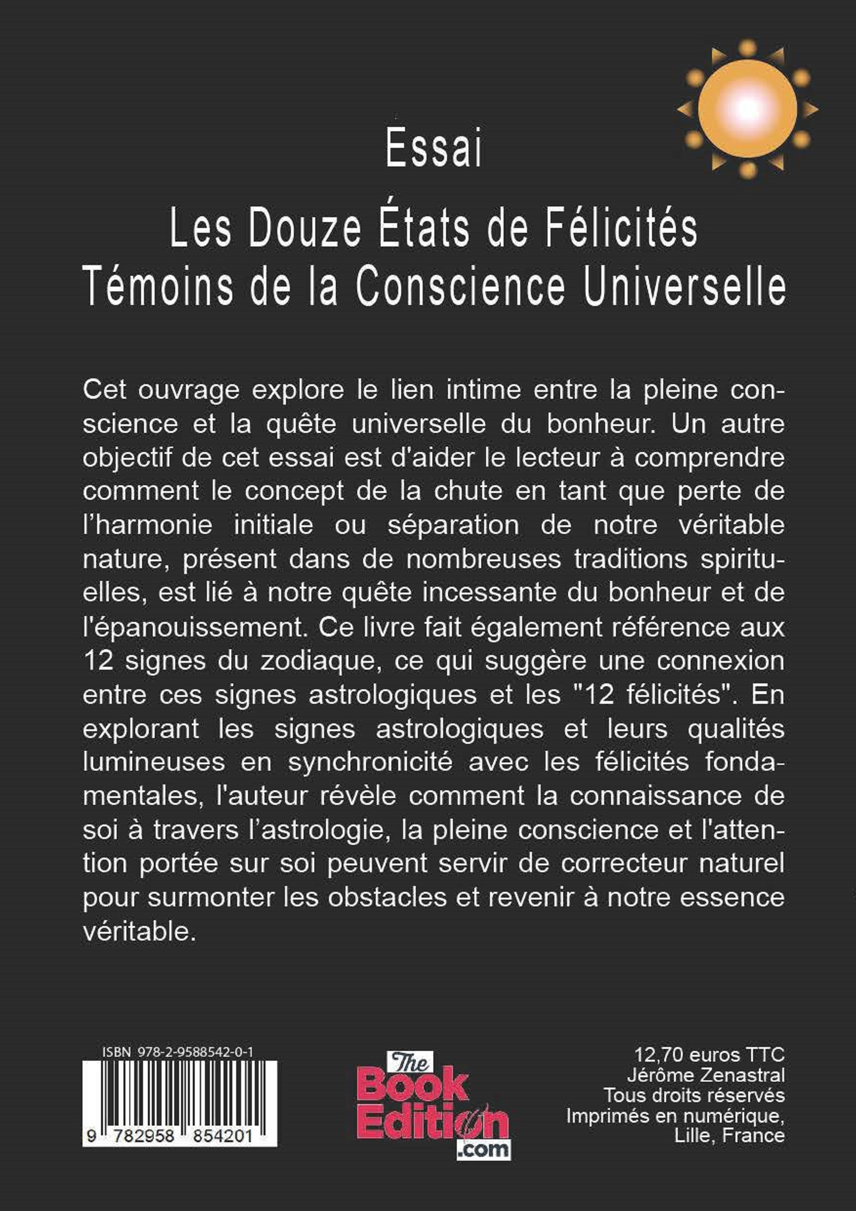 Cet ouvrage explore le lien intime entre la pleine conscience et la quête universelle du bonheur. Un autre objectif de cet essai est d'aider le lecteur à comprendre comment le concept de la chute en tant que perte de l’harmonie initiale ou séparation de notre véritable nature, présent dans de nombreuses traditions spirituelles, est lié à notre quête incessante du bonheur et de l'épanouissement. Ce livre fait également référence aux 12 signes du zodiaque, ce qui suggère une connexion entre ces signes astrologiques et les "12 félicités". L'auteur révèle comment la connaissance de soi et l'attention portée sur soi peuvent servir de correcteur naturel pour surmonter les obstacles et revenir à notre essence véritable.